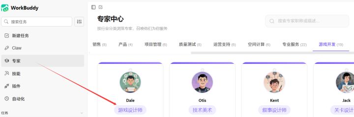 直入主题:单纯让塔拉拉完成所有工作,积分消耗非常快。所以我们需要一个辅助工具,马总旗下的workbuddy(现阶段送的积分几乎可以高强度无限使用一两个月)减少大量和塔拉拉重复沟通消耗的积分1.先下载workbuddy,一键部署好:在主界面专家这里选择游戏设计师,然后在我们需要制作某个模块时,直接用workbuddy制作好,然后把功能模块迁移到塔拉拉,直接就可以完成实装,相当于花马总的钱办