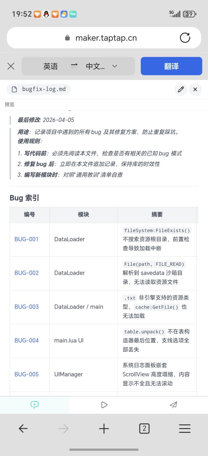 经过大家提点才用了这个小模板(塔拉拉自己生成的),大家做游戏的是时候一个是做好自己的开发进度和技术手册,另外最重要的就是bug处理库了,可以省下大量修bug的时间和积分。提示词我一会放评论区。这个文件只需要给出提示“从我做一份bug修复管理库,并制作md文件放入docs文件夹中,要求如下”,但就是每次使用时需要让塔拉拉读一遍这个文件(长按docs中的文件名就行),因为你不说,塔啦啦就