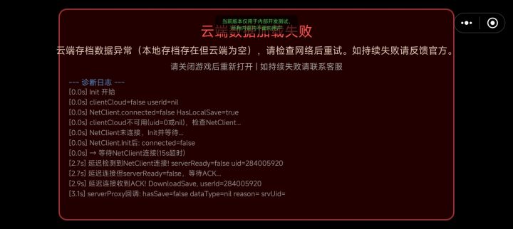 诊断日志 --- 诊断日志 ---[0.0s] Init 开始[0.0s] clientCloud=false userId=nil[0.0s] NetClient.connected=false HasLocalSave=true[0.0s] clientCloud不可用(uid=0或nil),检查NetClient...[0.0s] NetClient未连接,Init并等待...