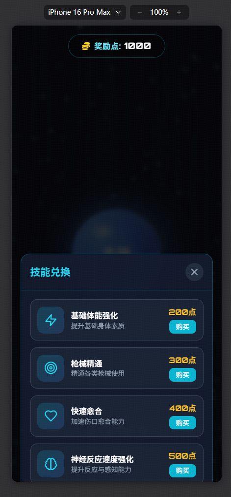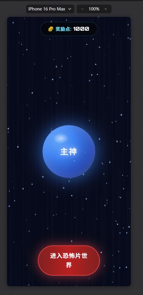 用AI写了一个H5小游戏,类似于小说无限恐怖,可以从副本世界里获得奖励点或者其他道具然后从主神处购买技能,再次进入,希望可以有机会获得资格可以让我更有效的做一个小游戏,谢谢开发大佬