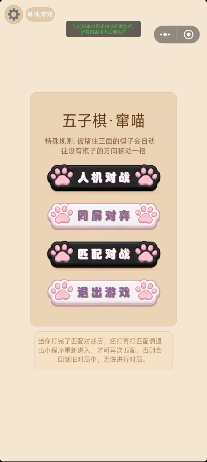 游戏名:五子棋·窜喵 游戏类型:这是一款猫咪主题的五子棋变体棋类游戏,支持单机 AI 对战、同屏双人对弈和在线匹配三种模式。 核心玩法:标准 15×15 棋盘上的五子棋规则——双方交替落子,先连成五子者获胜。 最大的独特之处:"窜喵"机制 这是游戏的灵魂玩法,也是名字的由来: 当一颗棋子的上下左右四个方向中有三面被堵住时,它会自动向唯一空闲的方向滑动一格。 这意味着每一步落子都可能引发连锁反应——