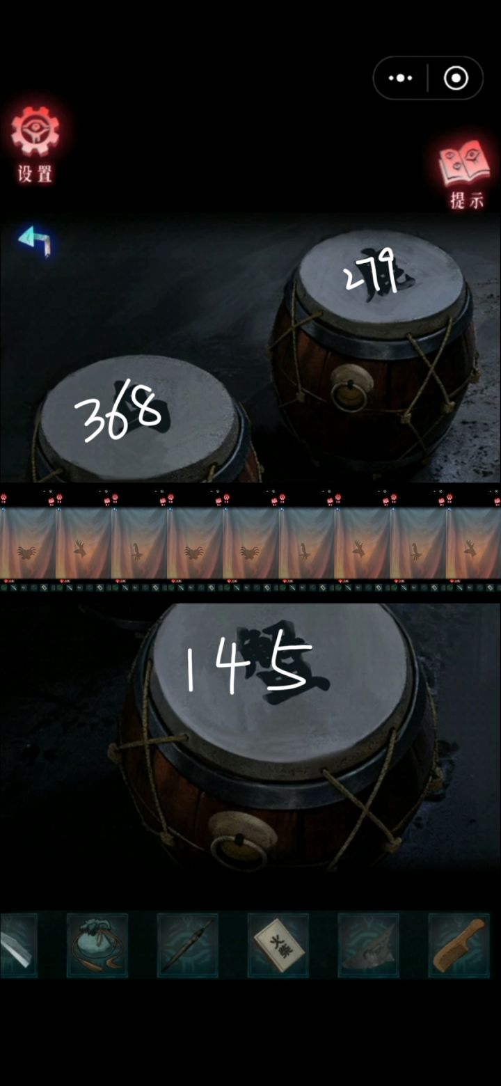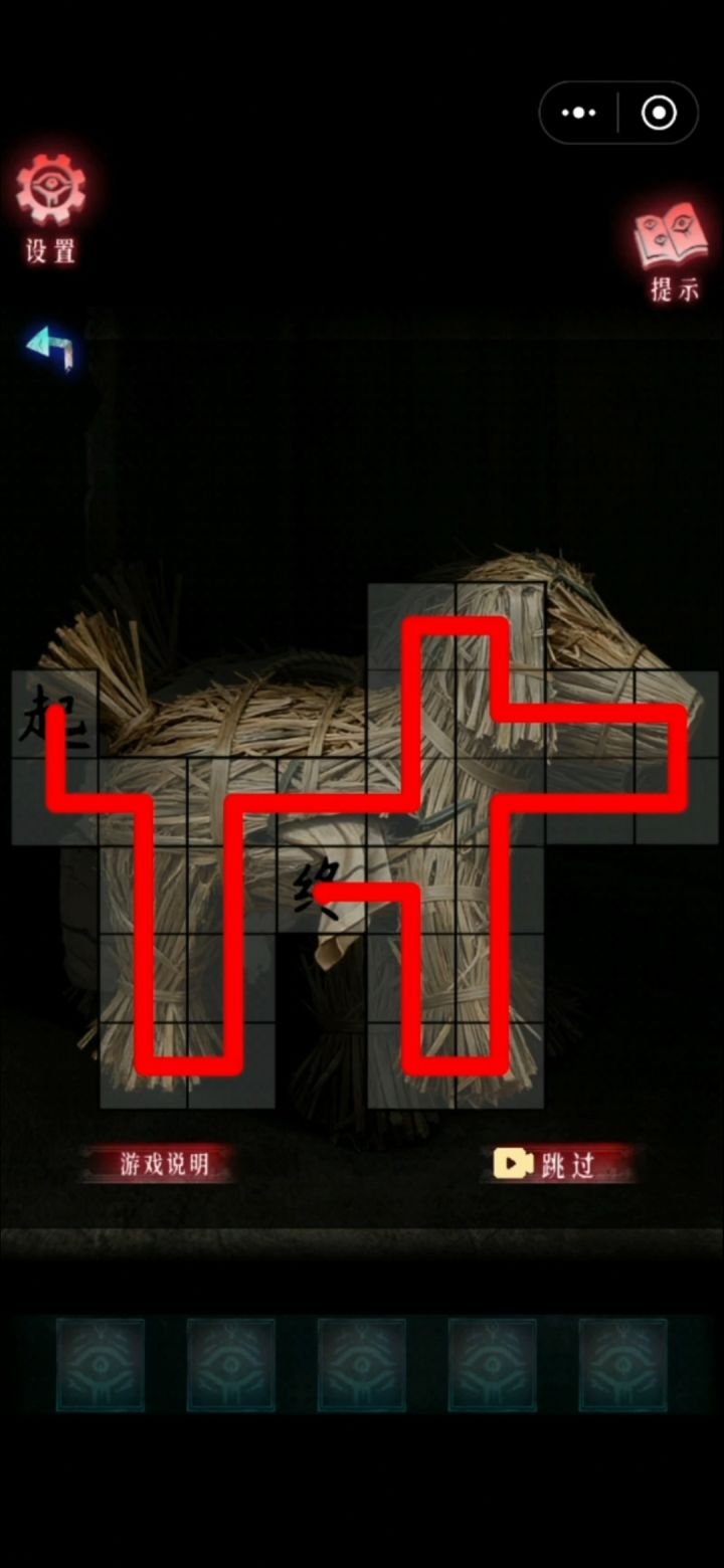 1。点击祭台,拾取刀。2。灯笼下面,拾取布片。3。刀割开刍狗身上的绳子,解开谜题(如图),获得捆绳。4。用绳子把迷雾前的木头吊起来,获得字旗。5。根据祭台下面的文字,摆好祭台上面的物品。(如图)获得锤子,古书,墨粉。6。根据布片上的灯笼位置,用锤子敲击灯笼。一个简单的联动机关。获得指南针和路引。7。进迷雾。根据路引上的提示、指南针的方向、石头数量,完成方向。注意!!每一回合指南针的方向