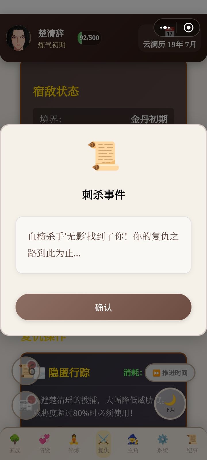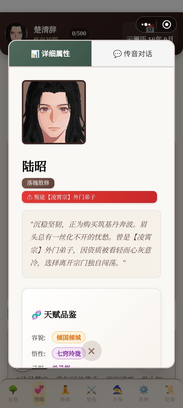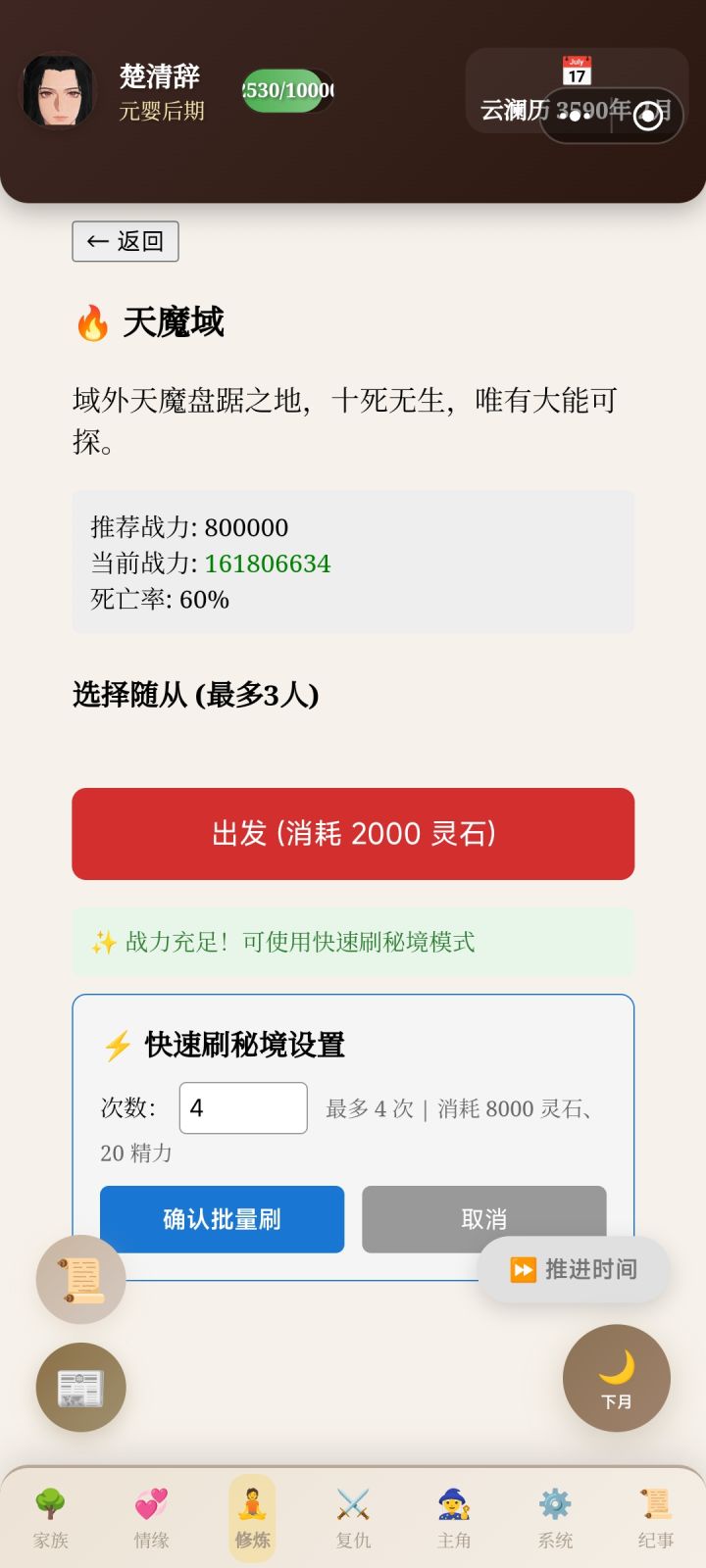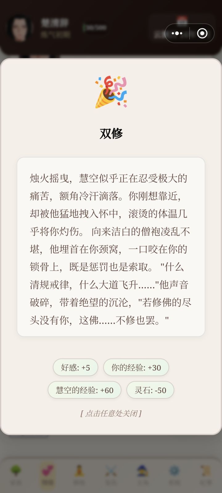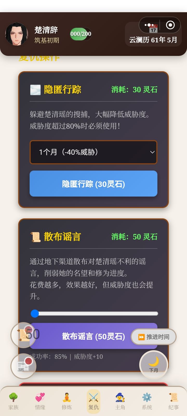 1.建议提高宿敌和遇到的npc的修为,有灵根的人6岁开始修炼,宿敌和那些npc资质很高,我双灵根的孩子在没有任何干预的情况下18岁就已经筑基,那些天灵根和变异灵根的,二三十岁了,还是练气就很离谱2.把渡月改成渡年,加上行动点限制,延长游戏可玩性。这本来就是一个靠养成孩子来反哺自己的游戏,但是养成时间太长了,想要让孩子去做什么基本都得等到他们18岁之后,一个月一个月的过吧时间太长很麻烦,快速推进,