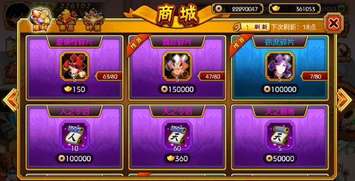 各位主公下午好!,欢迎来到小乔的攻略站,今天给大家带来的是游戏中商城的基本介绍 商城是游戏中兑换武将碎片、武将升阶和升星材料、体力等重要道具的好地方~ 商城兑换货币分为铜钱和元宝。商城每隔两个小时自动刷新一次,或者可通过刷新令进行刷新,刷新令用完了可以使用元宝进行刷新。每日刷新的上限为12次,开通VIP可以增加刷新次数,来获得自己想要的东西。 商城又分为限时刷新、常驻商品和时装三个部分。限时