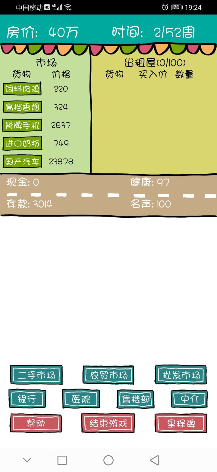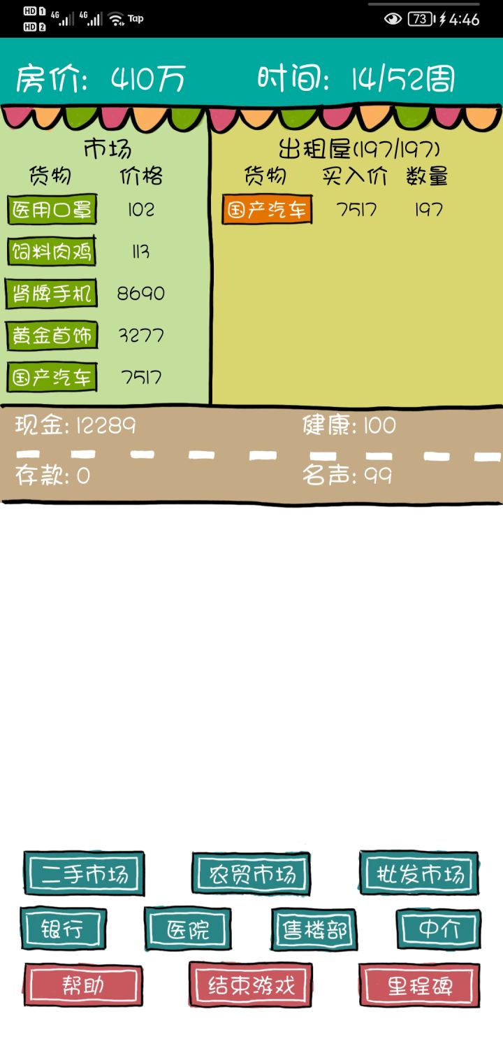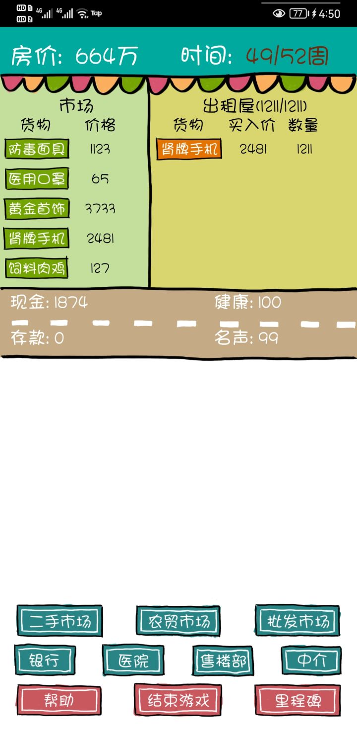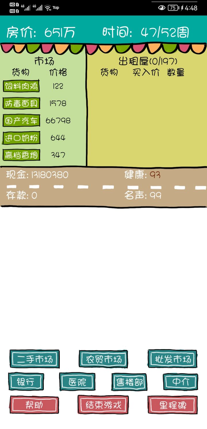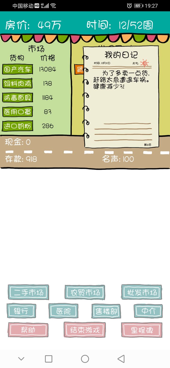 各方面都还挺好的,就是唯一一个不足的就是如果说你中途有点什么事儿,游戏切出去了,然后再切回来,他就会直接变成重新开始,不能读档,那这样就还挺麻烦的,那个买房代金券也没掉了