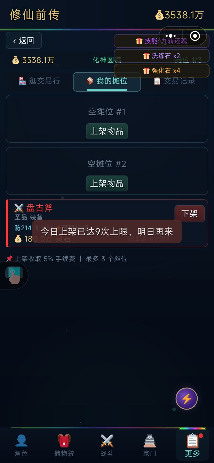 如图,本来交易行就是买卖,这游戏灵石开销太大,多买卖赚点灵石,一天限制9次那还买卖个啥?建议取消。