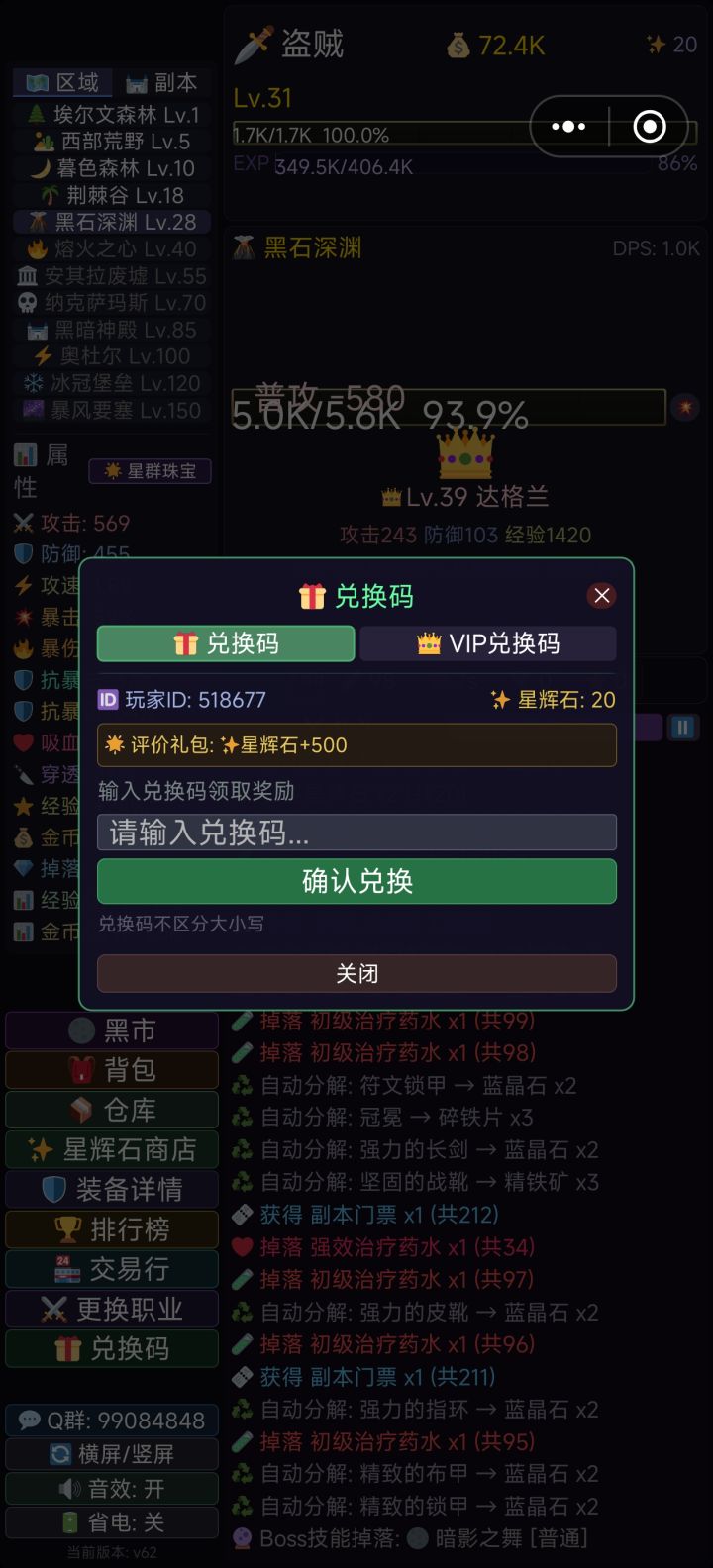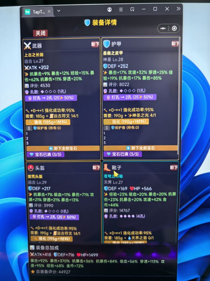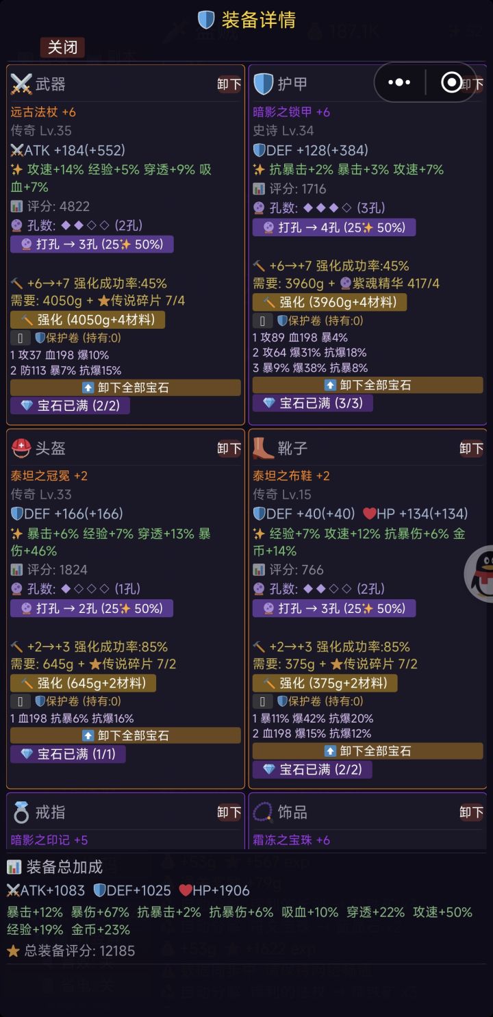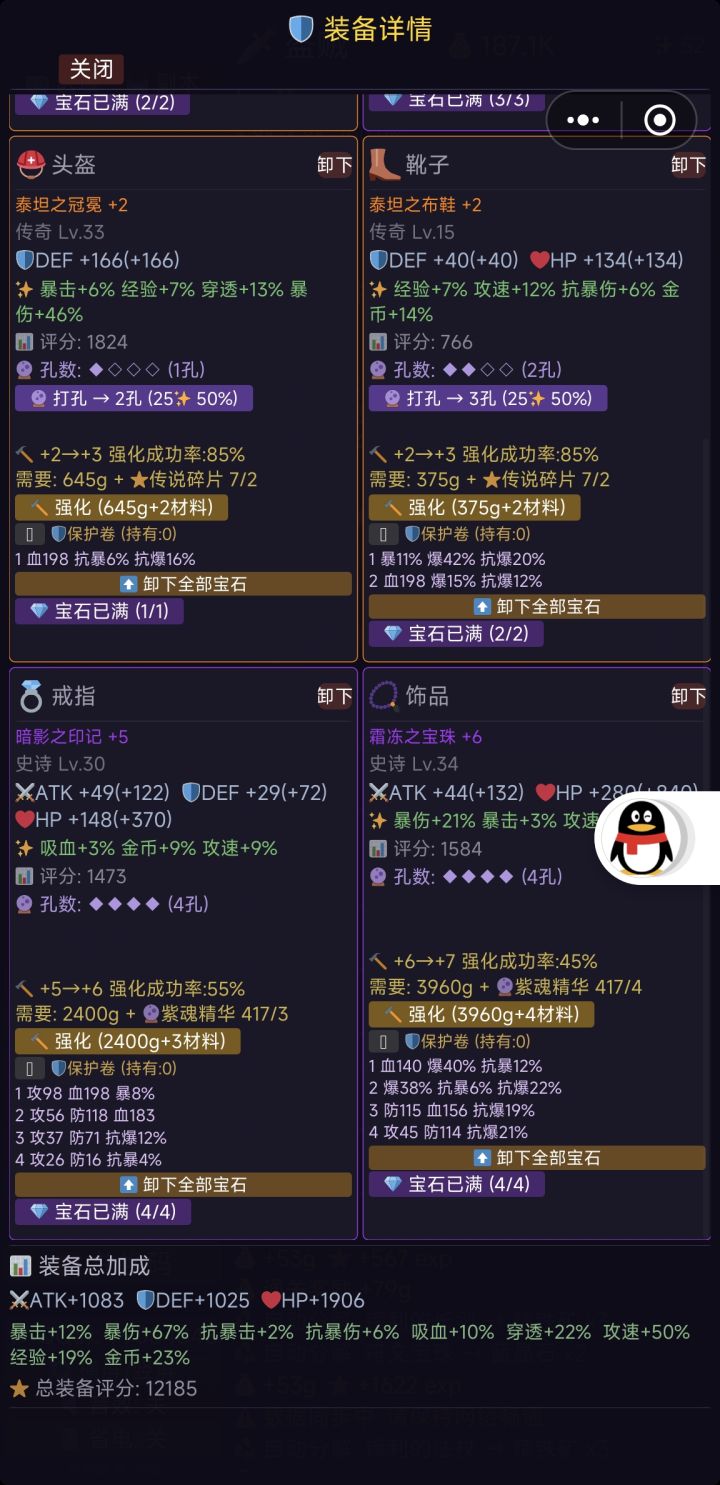 摸鱼必备,主要就是挂机游戏,前期主要带紫色多孔装备,把攻防堆到1500以上就能打第一个副本了,主要掉落高品质装备。后期就主要堆攻击 , 暴击 ,爆伤, 抗爆,越高越好。需要注意的是 ,强化装备先把宝石卸了,要不然宝石也会消失,装备打孔失败不会爆装备,强化虽然概率容易炸,但是每次都能增加50%主属性,所以收益与风险并存。最后,进游戏先加群,群友男的帅,女的漂亮,说话又好听,任何问题都会给你解答,