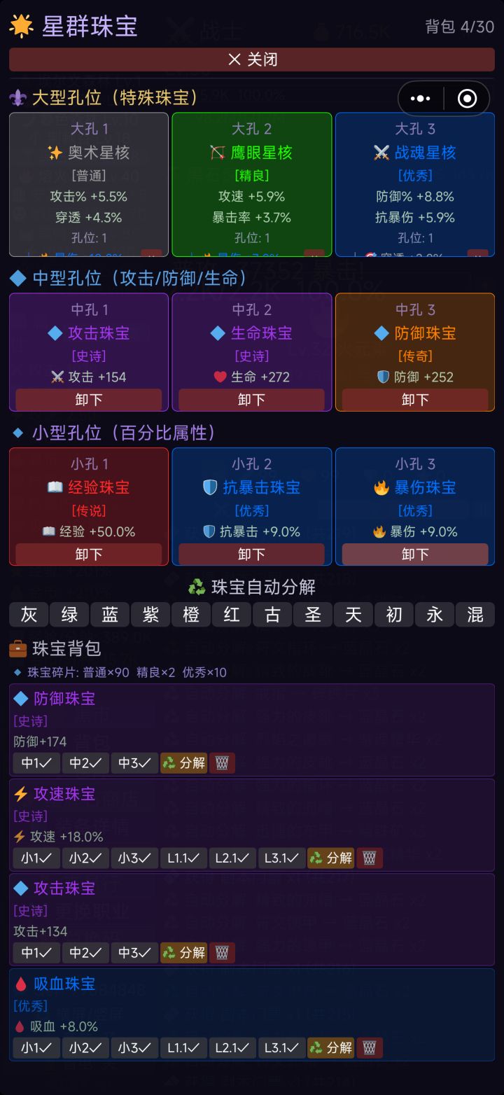 刷到四十了,有一点个人心得,不一定对,仅供参考。首先是攻防血三个基础属性。防御减伤公式不知道,大概可以降低一半防御值的伤害。但其实作用不大,后面的boss都是几千上万的伤害,防御怎么都堆不上去。血量作用很大,毕竟一下就被秒,说什么都没用。血量增加主要靠鞋子,戒指,饰品。这三个装备建议选等级高的。注意是高等级不是高品质,高等级基础属性高,高品质附加属性高。攻防属性低一点可以用宝石补充,但