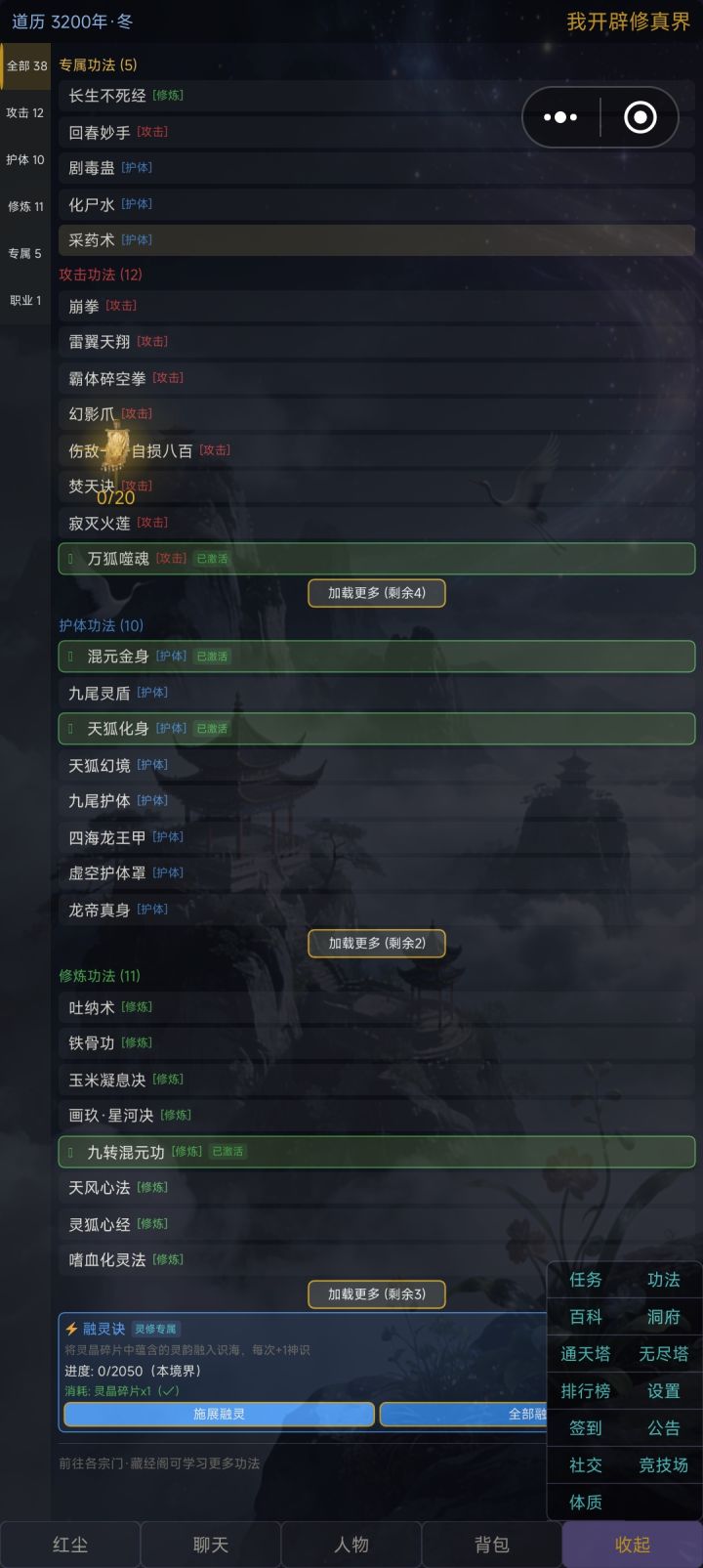 1,关于战斗记录以及获取记录能不能改成当前登录的历史总览,退出登录再清除就行,下面显示框滚动太快,根本看不清,往上滑动又被刷掉了,只要能查看上个战斗的详情就行。2,关于功法的介绍能不想详细一点更直白一点,比如功法的强弱品阶之类的,或者直接写明当前加成效果,有没有隐藏属性或者效果,我这才收集两个门派的功法,都不知道那个功法强那个弱。3,在人物属性界面在添加一个当前加成的渡劫成功率真的很重要。