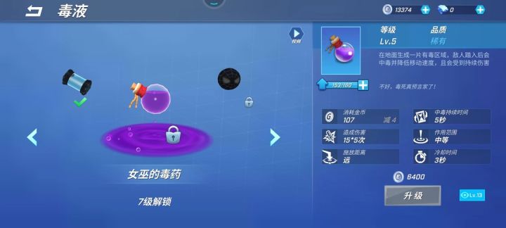 毒液解析品质:稀有冷却时间:3秒造成的伤害:15*5次中毒持续时间:5秒消耗金币:120(会随着道具升级而减少)介绍::消耗120金币在指定区域抛出装毒液的罐子,打碎后会在范围内产生毒液,降低逃生者的移动速度及跳跃高度,每秒造成15点伤害,中毒时间可以持续5秒。收集方法为大家介绍一下【毒液】这个道具的收集方法。这款道具卡的收集还是比较容易的,因为这个道具只属于稀有道具,我们可以在银蓝卡包都
