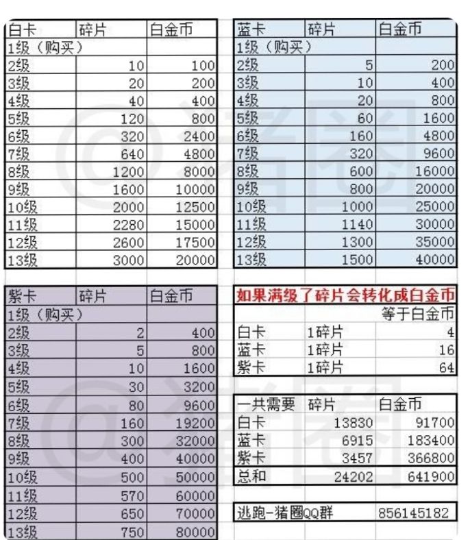 逃跑吧!少年道具卡升级表。 百度上搜到的希望可以帮到大家