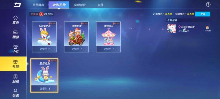 大家帮我关注一下这个人!她在大厅打字说互送5200礼物,我本来是想点一朵花的,没想到网卡了,不小心送出一个甜蜜相伴给她😂。我真的想笑😂😂,送出礼物,我当时人傻了,没想到的是,她直接送我一个星月兔兔给我,我心里好激动! 因为这是我在这个游戏里第一次收到这么心动💗的礼物🎁,今天好开心!人生中第一个钻礼