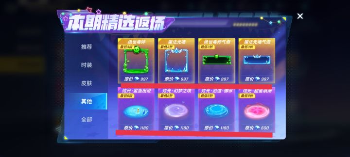 道具卡皮肤1000多钻石,一个头像框900多钻石,还有鲨鱼眩光在商城里面卖60钻石,在这里面原价1000多钻石,再在这里边随便一个炫光600钻石,角色一套皮肤3000多钻石,然后一块钱十个钻石