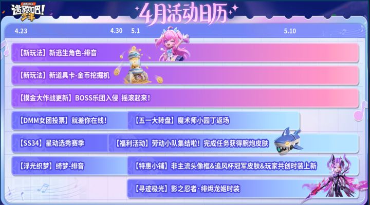 亲爱的少年:我们将于4月23日9:00-10:00停服,进行版本更新维护,届时游戏将无法进入,新版本主要活动如下,祝各位少年游戏愉快!一、新角色活动活动时间: 2026年4月23日-2026年5月14日活动描述:偶像歌手・绯音登场!观看角色PV、完成练习任务,丰厚奖励等你领取(1)角色PV:活动期间可在新角色页面观看偶像歌手・绯音的角色PV及技能套路视频(2) 任务奖励:完成角色练习任