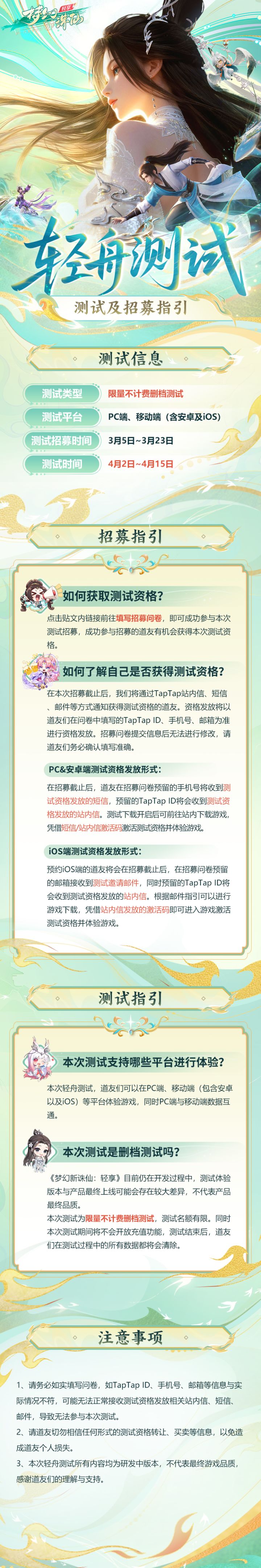 《梦幻新诛仙:轻享》预约现已开启,道友召集中!各位道友~《梦幻新诛仙:轻享》「轻舟测试」现已正式开启,如下为本次测试基础信息:测试类型:限量不计费测试测试平台:PC端、移动端(含安卓及iOS)测试时间:4月2日10:00~4月15日已获得测试资格的道友们,可以前往游戏主页下载游戏注:获得测试资格的iOS用户将会收到站内信提醒,可通过站内信下载渠道下载游戏本次测试过程中,如遇任何问题或