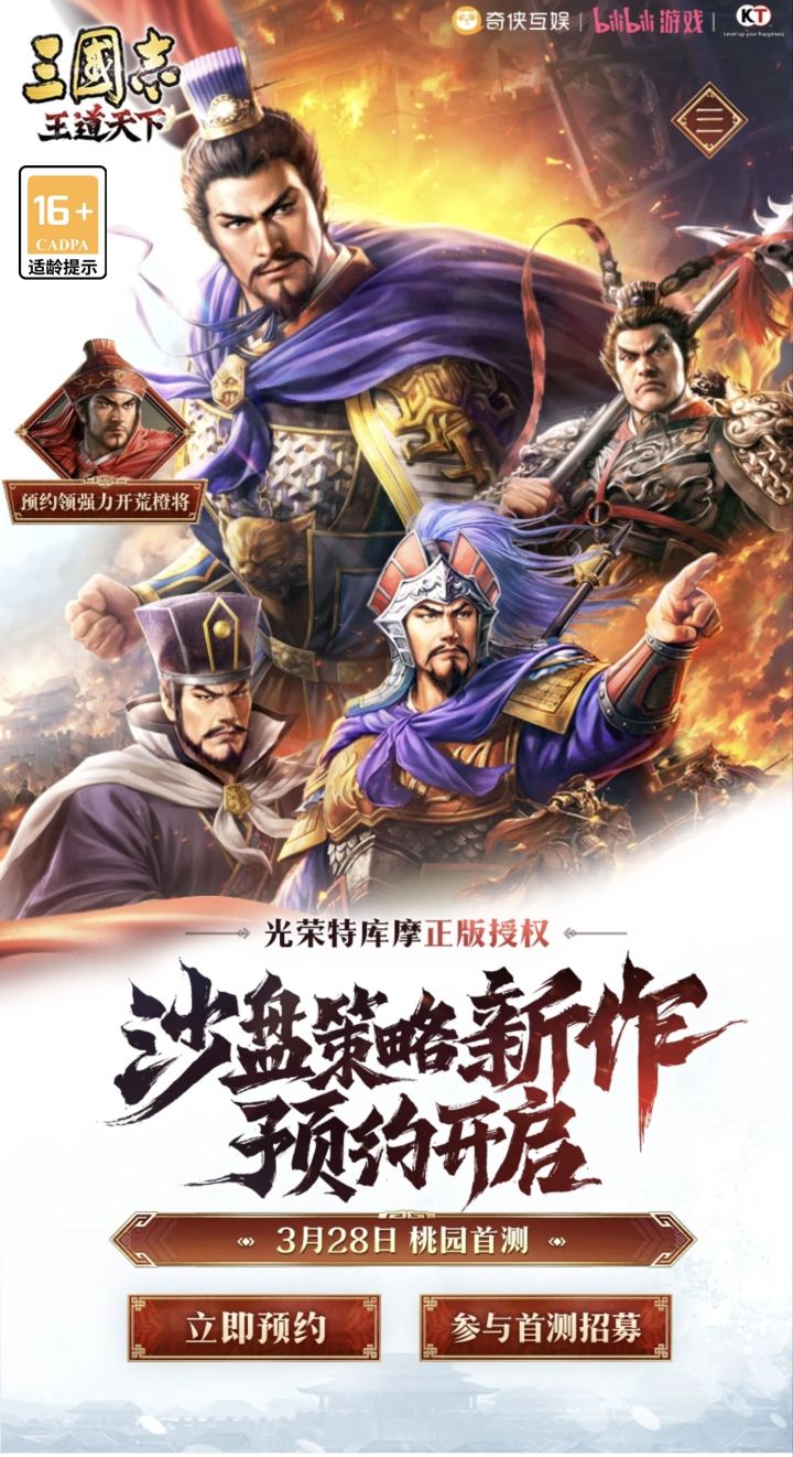 诸位主公,今朝初会,不胜欣喜!光荣特库摩正版授权,沙盘策略新作《三国志:王道天下》现已开启预约,诚邀各位主公共赴这场热血纷争,书写属于自己的三国霸业!▉ 桃园首测资格招募招募时间:2026年3月18日-3月25日18:00测试时间:2026年3月28日10:00开启预下载时间:2026年3月26日测试类型:不计费删档限号测试测试平台:安卓▉ 测试参与方式1、 测试招募:填写Tap