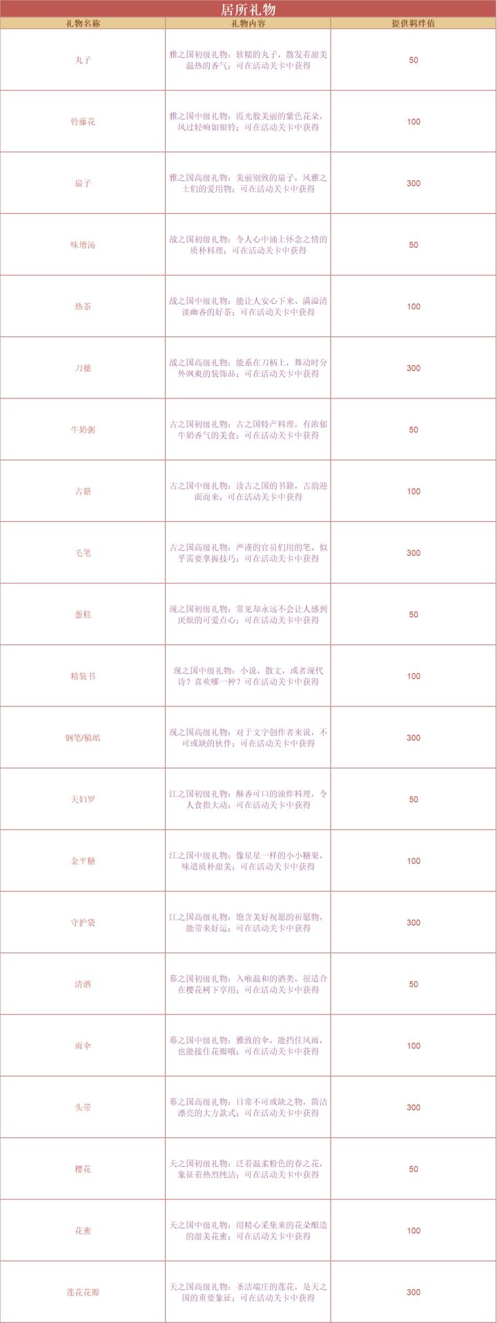 攻略组来啦!为大家带来居所礼物详情表格!大家也可以到wiki上查询哦http://qswiki.ppgame.com/index.php/%E5%B1%85%E6%89%80%E7%A4%BC%E7%89%A9快来给男子们送礼物吧~