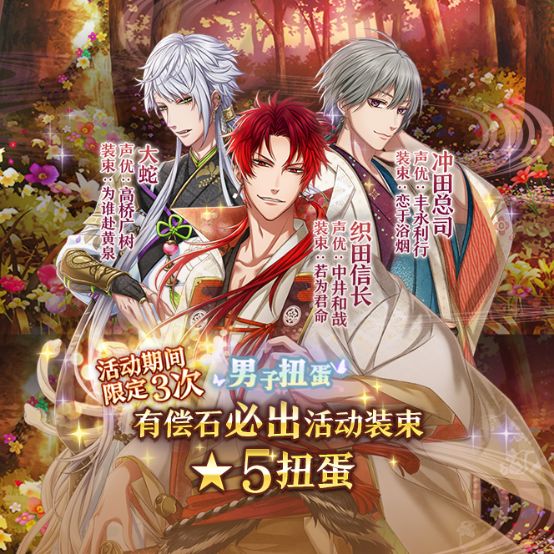 活动时间:11月11日15:00-11月15日12:00活动说明:活动期间巫女大人点击主界面滚动宣传图及“召唤”按钮进入活动扭蛋界面可进行step up召唤,召唤规则如下:Step1:使用月华石10个召唤3次Step2:使用月华石40个召唤5次Step3:使用月华石100个召唤11次,第11位男子★4及以上※ STEP UP扭蛋出现男子及概率请在召唤-活动扭蛋界面点击图片查看。【成长助
