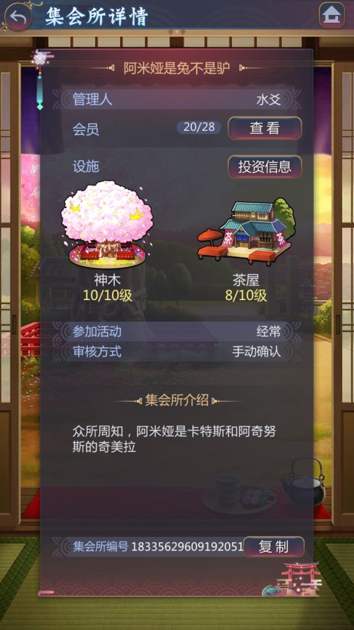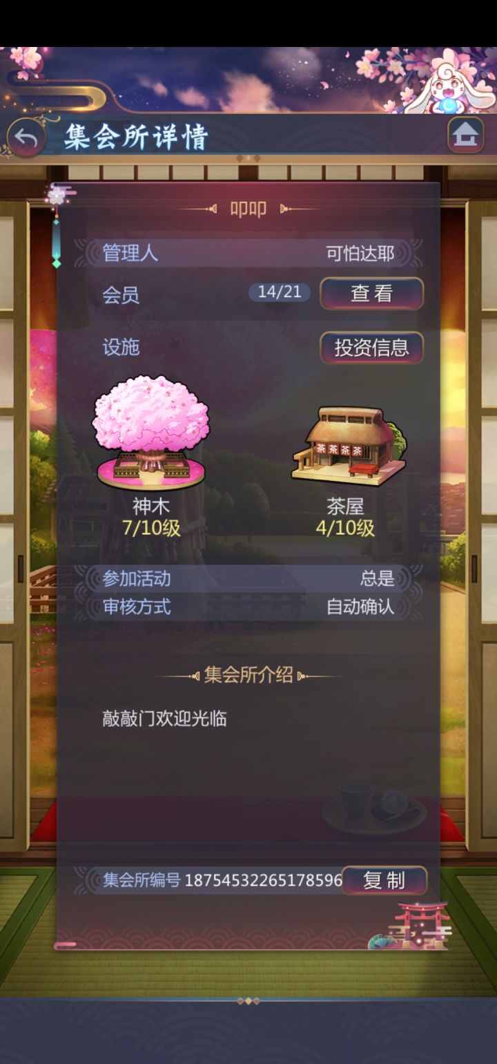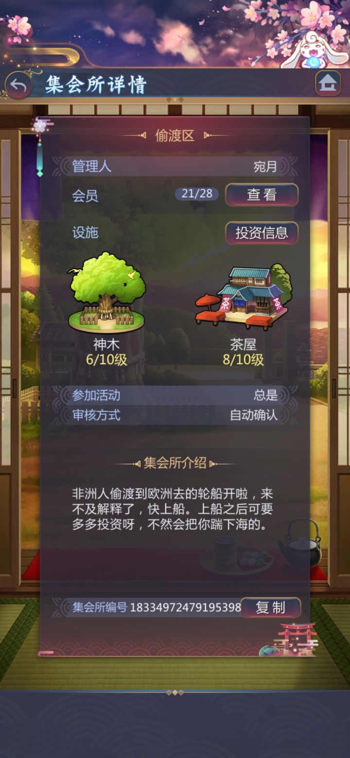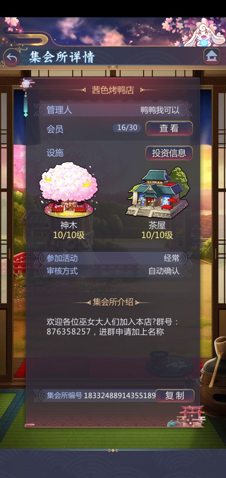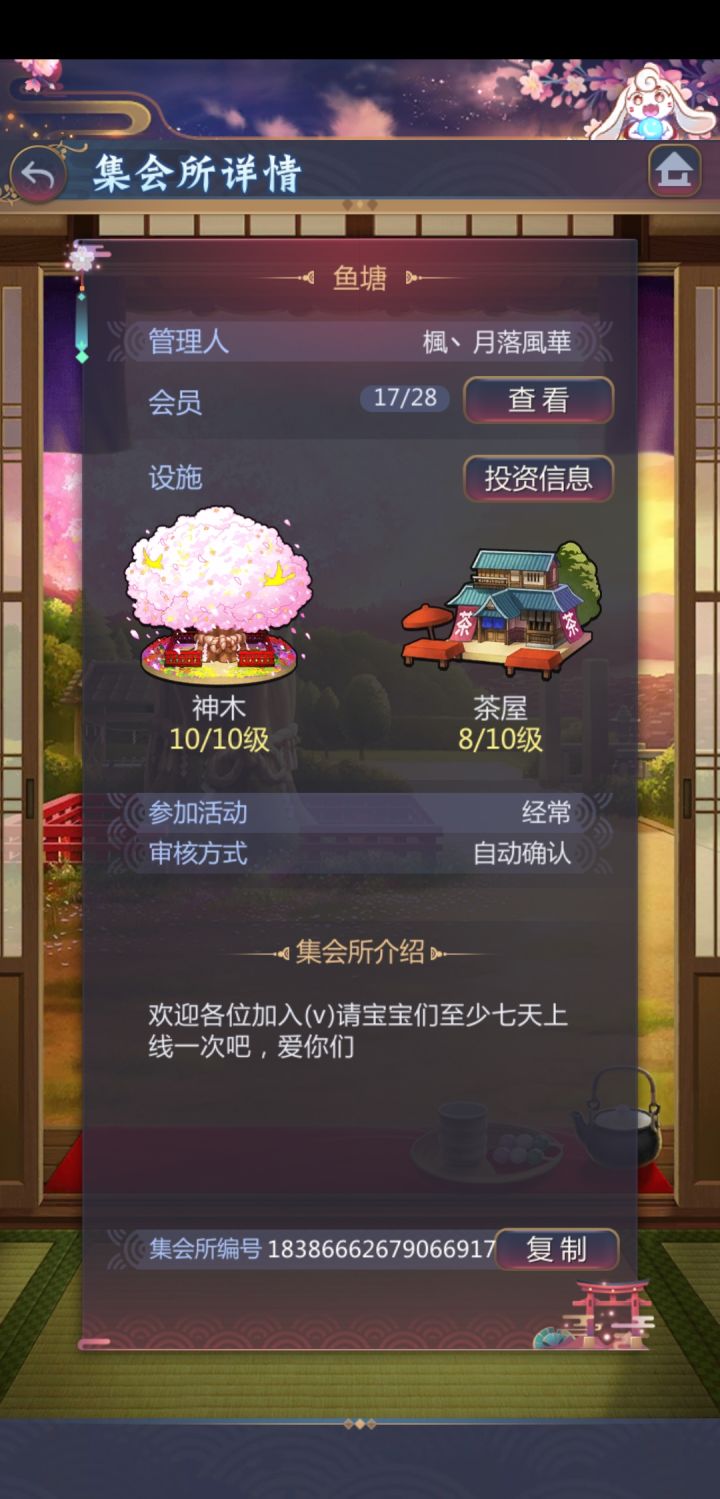 虽然设施不是满级啦。。。但是希望集会所可以热闹起来!不管是养老还是闲聊都可以鸭!!快让我们一起磕男人₍₍Ϡ(੭•̀ω•́)੭✧⃛集会所编号18754532265178596qq群:926127115