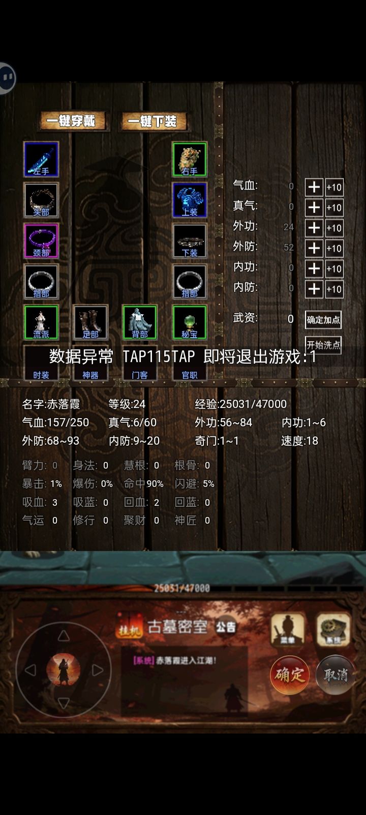 古墓主人只要掉落押镖令就会弹出数据异常,然后3秒倒计时自动退出,这掉率又低,打了一个通宵就掉了两个,第一次还没在意,第二次掉还是一样,真是无语了。