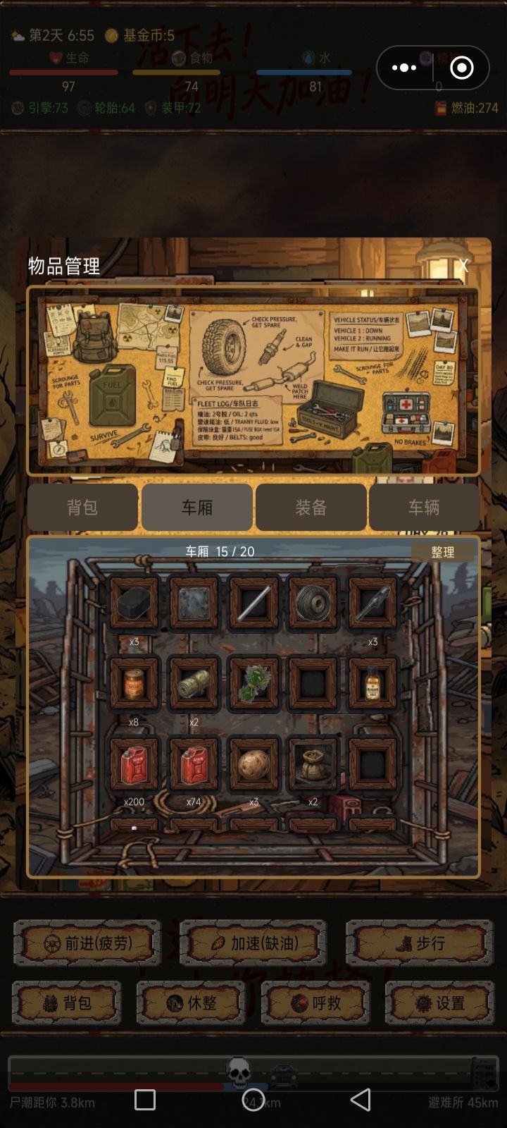 装甲属性没用bug:交易时长按+有概率卡死bug:被尸潮追上还能移动一两次。但这两次移动如果进入了庇护所,游戏还是会显示被尸潮追上。只有返回主界面再点继续游戏才能进入庇护所,代价是背包东西全无。bug,当精神归零时,抽烟后依然无法移动。尸潮移动速度是正常步行速度。可是为什么加速开车速度也就比尸潮快一点,很不合理。希望添加一个材料自动添加到车厢功能。老是理包很麻烦。大多物品没什么用钓鱼