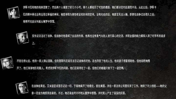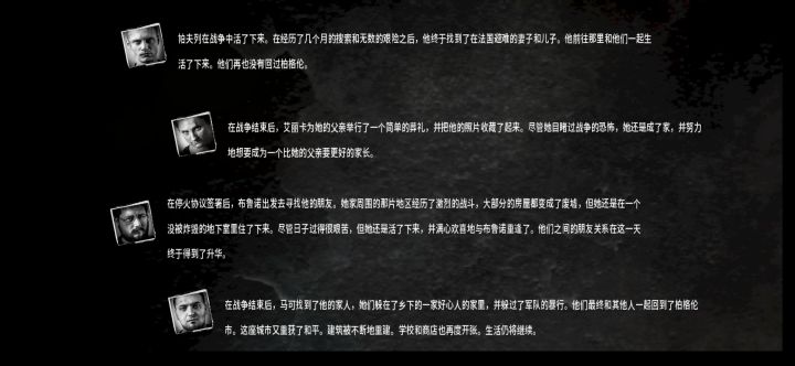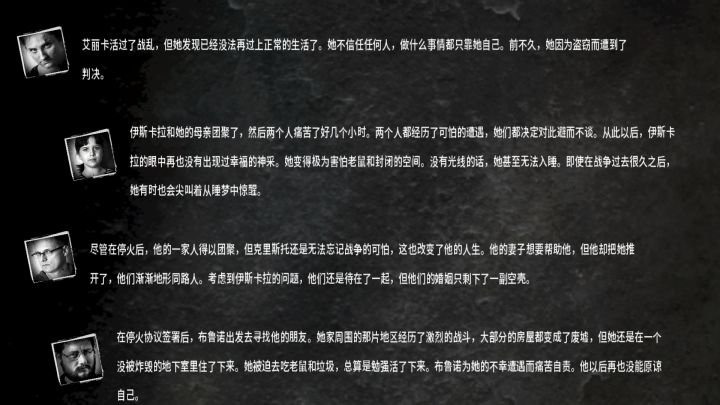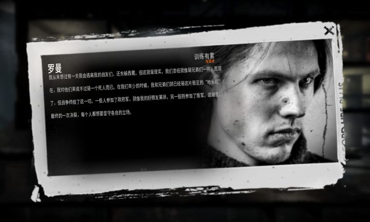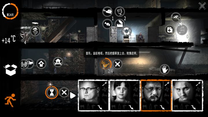 开的罗曼,布鲁诺和艾丽卡。因为我的生存策略的问题,罗曼在团队中的作用相当鸡肋,所以用他屠了旅馆,半毁小屋后就设计让他去了军队哨站,到那里无视士兵的警告,一路走到地图的另一边,那几个好脾气的士兵不停劝我珍爱生命,远离此地,继续无视,然后终于被几个暴脾气的士兵击杀。罗曼的死亡为后面到来的父女两腾出了位置。(超过四个人会出bug)之后就是轻松的生存了,我发现到40几天后我的心态都变化了,毕竟反正马上就要结束了,也不想去努力了,匆匆把人物喂到饱足,然后就结束了, 话说布鲁诺教小女孩做纸烟就离谱。。。