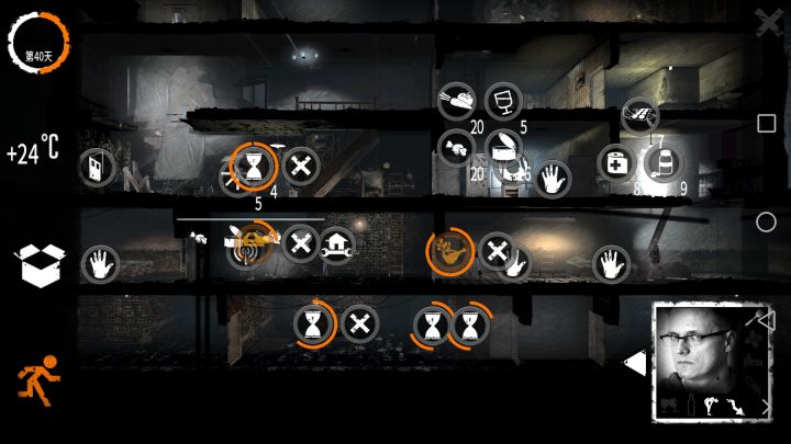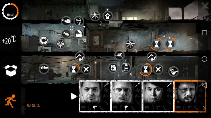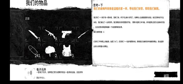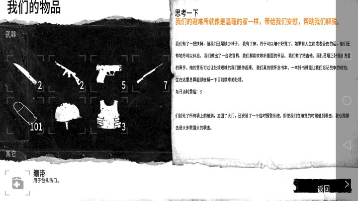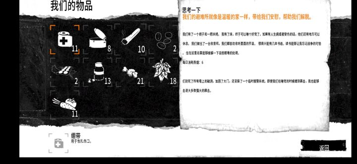 开始挺顺利的,后面真的很难了,主要缺食物,冬天不是很难,有足够的燃料熬过去了,在后面能拿物资的地图都拿了,其他的都是危险地图,后面都是一直靠交易来得到食物。但最终死在第45天。本来说可以通关的,人员都死于受伤,一个自杀,工具都拿来换食物了。说实话,我真的尽力了没杀过人,只偷过一次(不偷东西真的很难,但至少也只是一次)