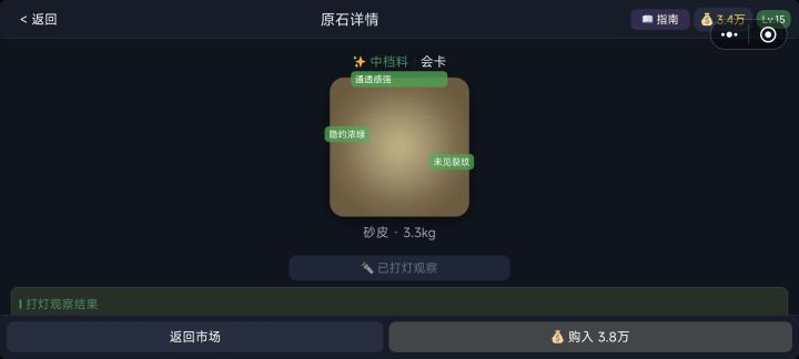 一定要打灯看看!一共三个指标1透光度,代表料子的质量(极小概率不透光也有货)2颜色,代表料子质量(无色基本都是垃圾,但是有小概率能出货)3疑似裂纹(大概率直接切烂,但是如果前两个都是高质量且价格不高可赌小概率没切烂)总体就是刷地摊货找绿色词条最后提醒一句:没钱别看买不起的货,心会痛