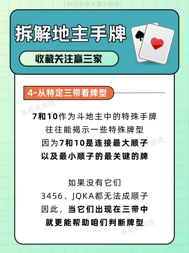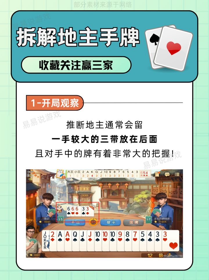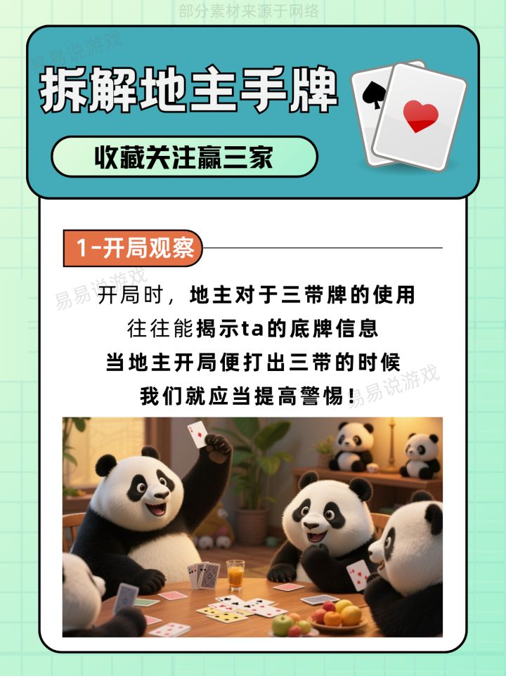 喜欢斗地主的小伙伴们快看过来!上周我被地主连虐5局后,学习了一大堆技巧,发现了惊天规律👉地主90%破绽藏在三带里!! 今天手把手教你们用【地主三带拆解】读牌术, 实测胜率提升,春天翻倍收豆,王炸都省着用👌! - 读牌术一:开局观察 读牌术二:从开局三带算底牌 读牌术三:从三带单牌算余牌 读牌术四:从特定三带看牌型 - 没想到这三张牌暴露地主秘密,打牌想输都难! 轮到你们实操