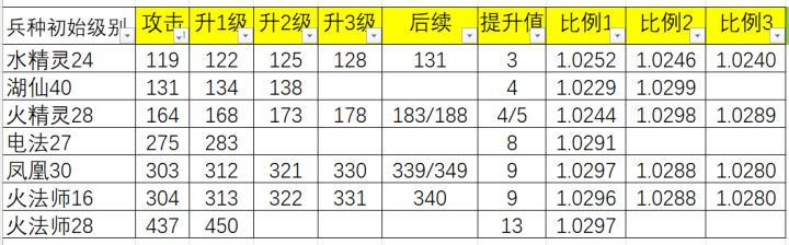 众所周知,兵种等级上升后,面板能看到攻击力和体力上升,其他数值则不会变化,那么每次升级能带来多大的改变呢?不同兵种或属性是S或A如何影响升级的数值呢?我拿最常见的法师队连续打了十几把,攒够了数据分析如下:不同兵种,ABS不同稀有度,兵种的攻击力生命值属性也有B到S+不同等级。可以看到,每个兵每次升级带来的数值大体固定,但级别高后悔增长,不同兵种提升的攻击力则和原有的攻击力正相关。看提升比例的话