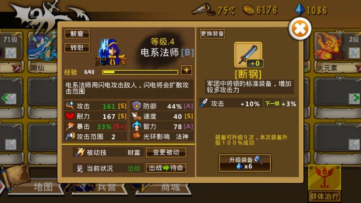 团长和主力英雄怕死,我都给买了加血量的防具,发现越低级的性价比越高,例如11钻买战袍就能提升10%,而同样效果买精铁战甲需要21钻,圣佑之铠需要30钻,当然如果钻石充足,高级装备上限更高。攻击武器也是如此,总之前期钻石不够可以先买最低级的军士刀和军士战袍来加强肉盾和输出。军士战袍(5钻,升级3钻)---血量+4%,每级+3%精铁战甲(15钻,升级6钻)---血量+8%,每级+3%圣佑之铠(3