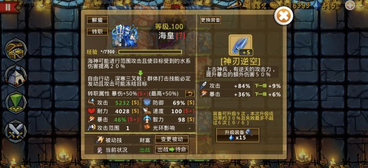 海神刷钻攻略 海神:2个,二转,搭配蓝刀,被动财富,二转幸运,暴伤都行,不强求,属性要求速攻爆。 水灵:8个,一转,不用武器(刷钻省钱),被动财富,属性要求攻爆。 其他:均为挂件,可以不出战。 团长:无要求。 无情的刷钻机器,全程只需两个海神出手,其他不用出战、出手。秒不了怪就把水灵一转,伤害还是不够的话,海神上蓝刀,根据关卡情况升级蓝刀就行。我的海神蓝刀6级,4个一转水灵,4个未转,6-35秒怪