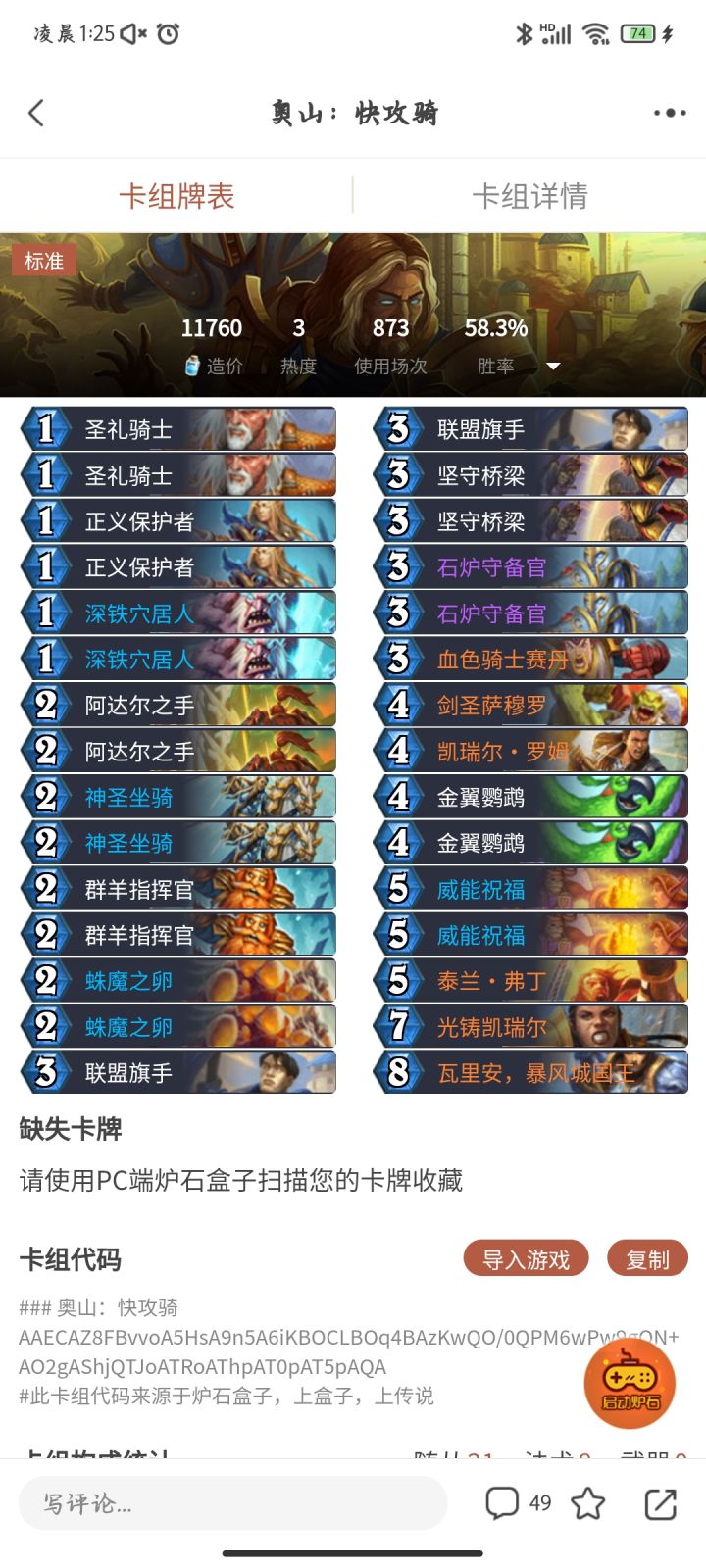 佬!玩一周炉石啦超喜欢圣骑士前面一直是自己瞎弄的卡组玩起来总感觉不对今天本来打算微氪亿点点抄一套但是刚看到明天似乎要版本更新了那我现在是直接抄盒子上的还是观望一波等明天更新呢↓(这是本来想抄的)