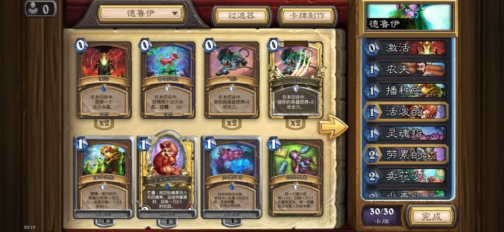 新人,想问一下我这里套牌有什么大毛病? 凭自己感觉组的卡牌,自己摸索出来的套路,感觉其实还可以再填几张别的牌进去,问题是暂时没有牌。 想问的主要问题是,我打圣骑就只赢过一次,感觉对面招白银之手这套路,我死也比不过,想不到什么办法在保持既有套路情况下还能克制他### 德鲁伊# 职业:德鲁伊 #模式:标准模式 #狮鹫年 ## 1x (0) 激活# 1x (1) 农夫# 1x (1) 播种