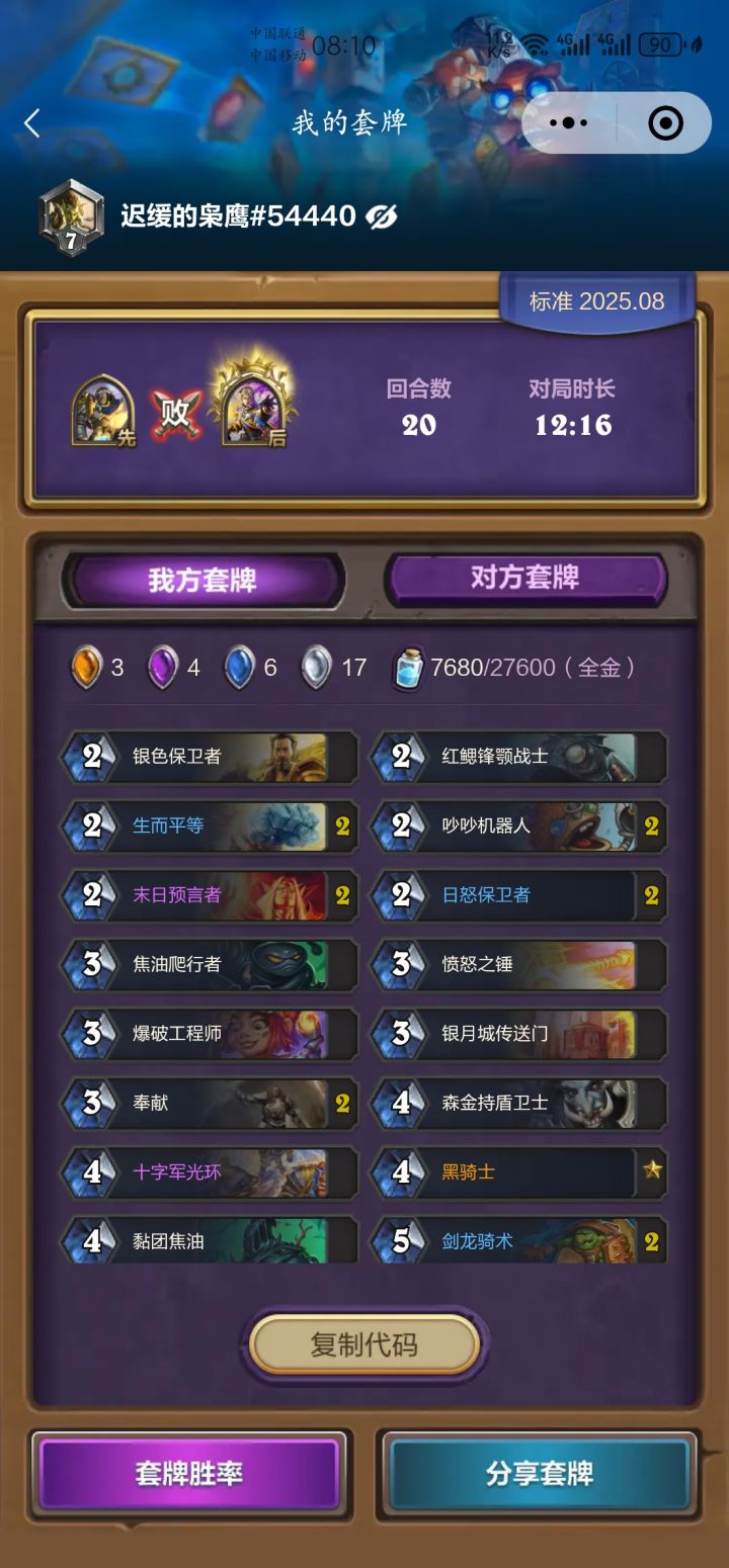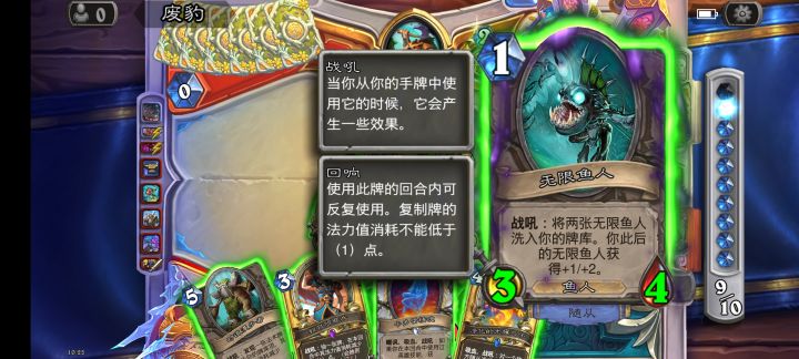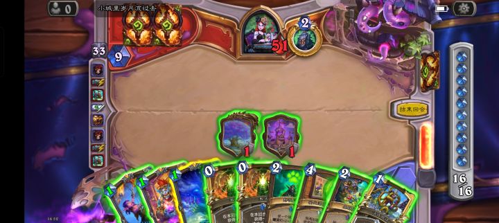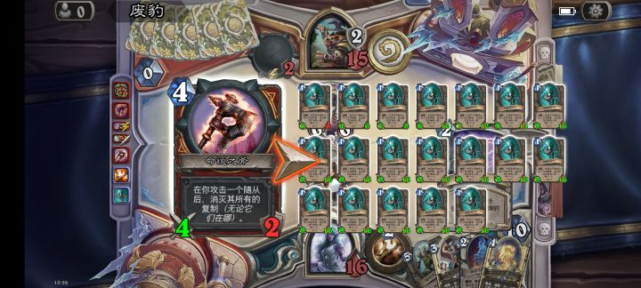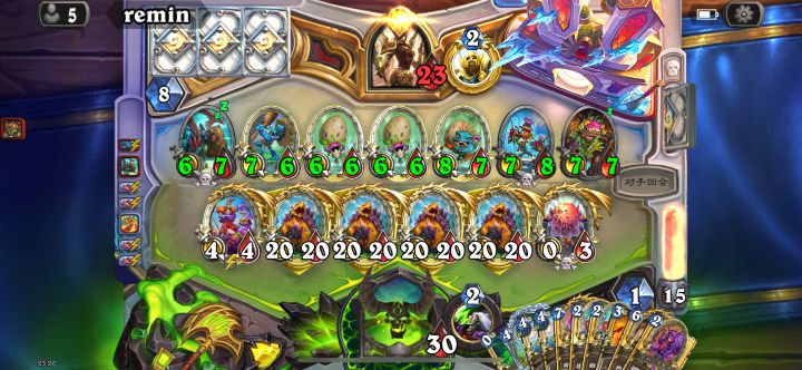 有一个技能牌,自己或则对手回合抽牌。本来加一个嘲讽就好了,放几个回合对手就把它打死了,然后我的神奇操作来了:1,增加2/6和嘲讽2,友方每次进攻增加2/1,3,抽出了可以繁殖的机器人,每次回合结束繁衍一个4,抽出了一个火焰龙,每次回合结束繁衍一个于是我很快没卡了,没卡之后抽一次掉血2个,然后我哐哐哐的20个血量没有了,对方还有1滴血,可是我在抽卡的时候挂了。AAECAZ8FEqa