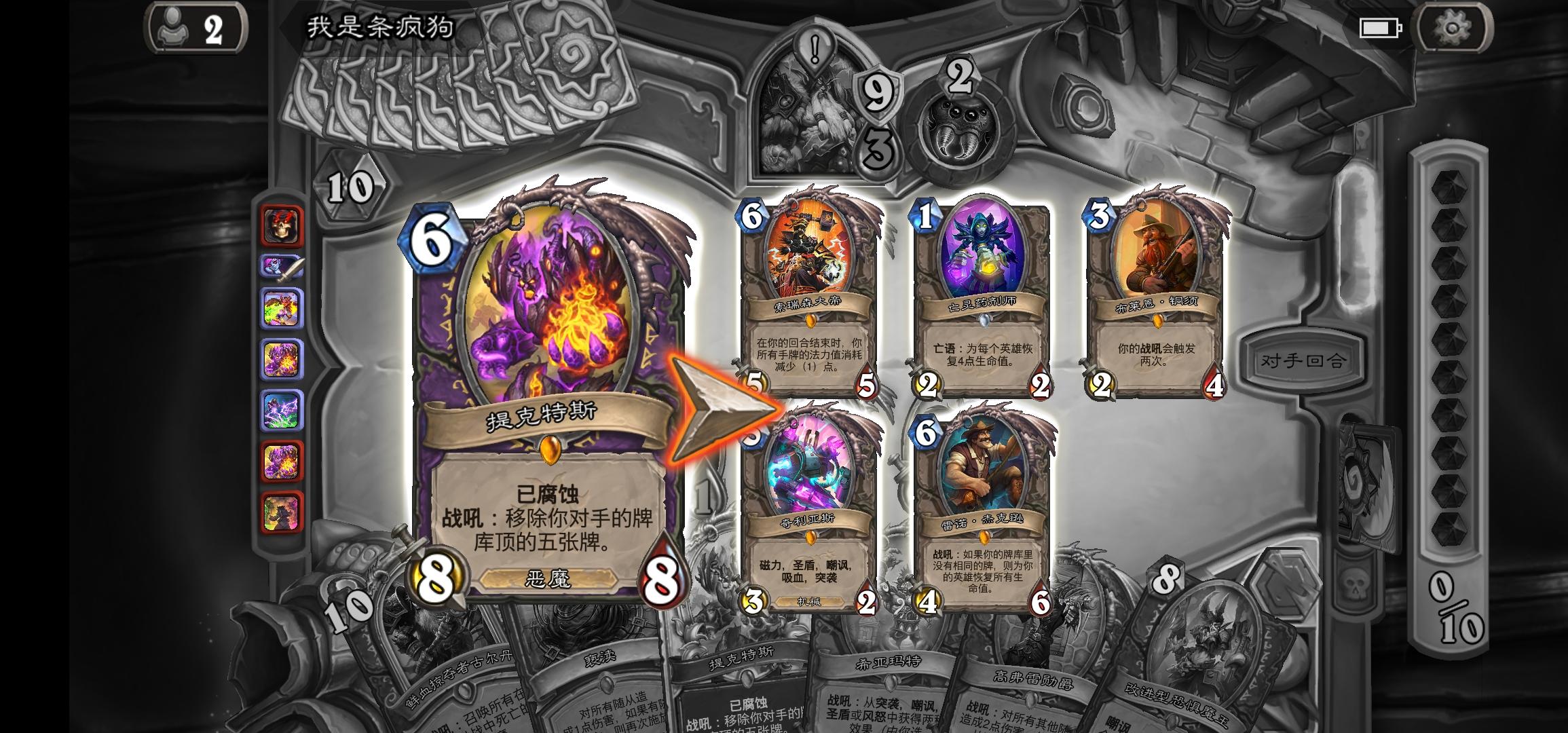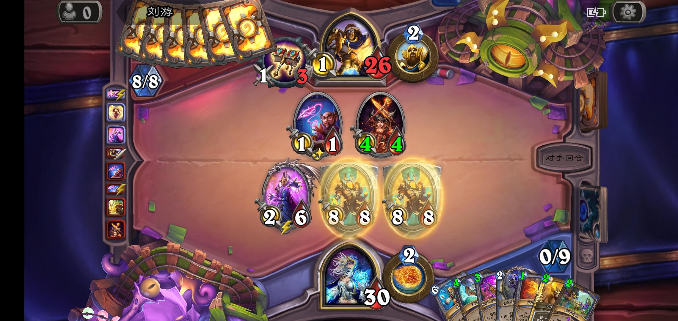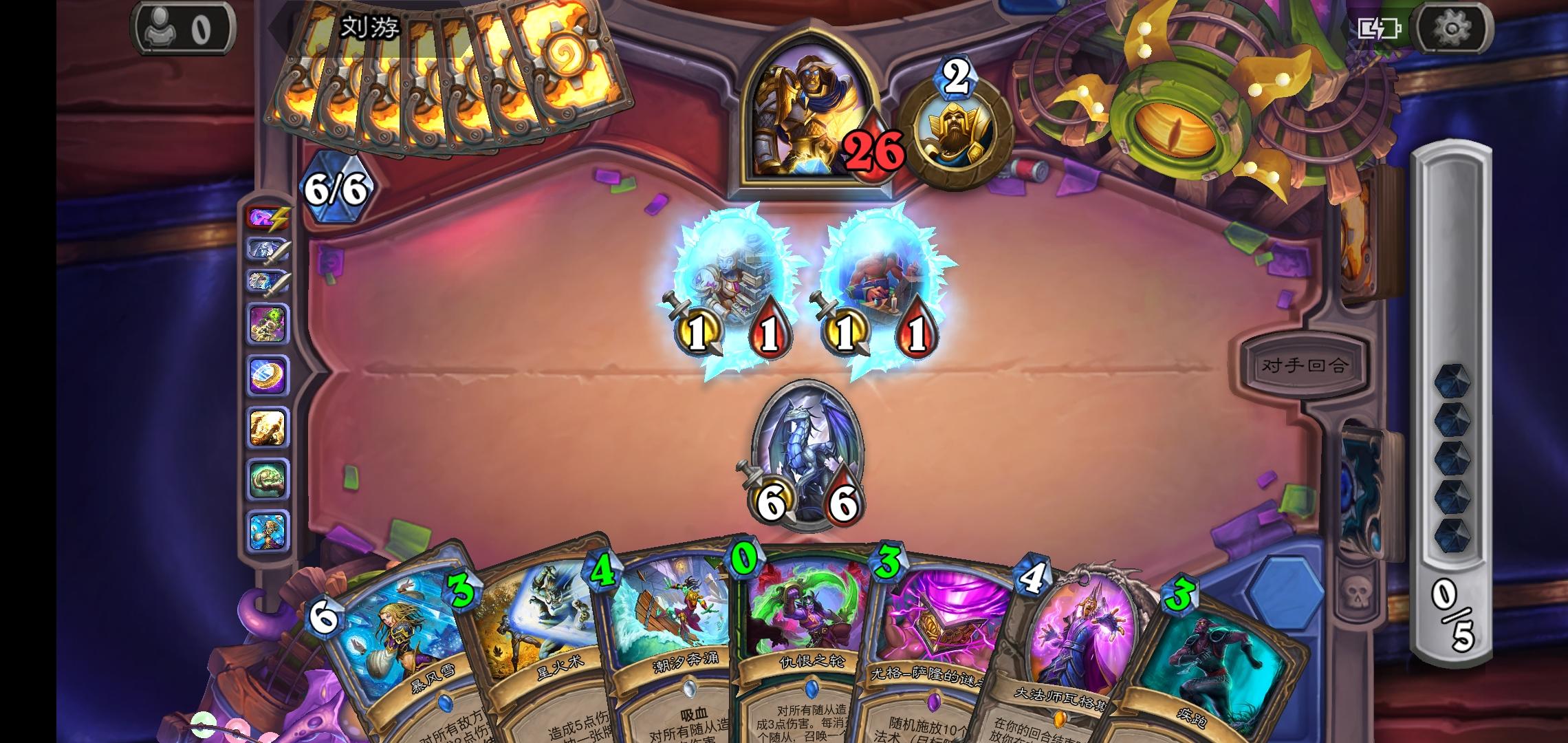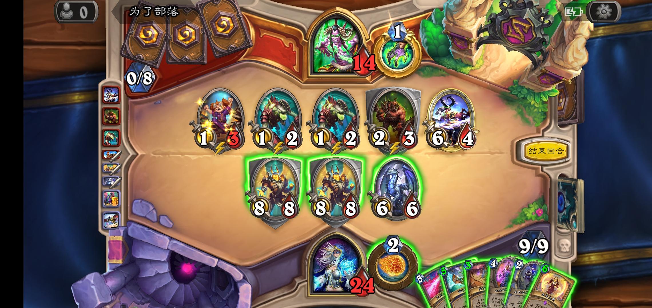 哇塞,刚刚进化萨碰到一个加基森+克苏恩+325减费的牧师,被我打到4血,硬是刷完了牌库,还解完了我的怪,六批六批,可惜运气不好,克苏恩没减到,我铺满了场