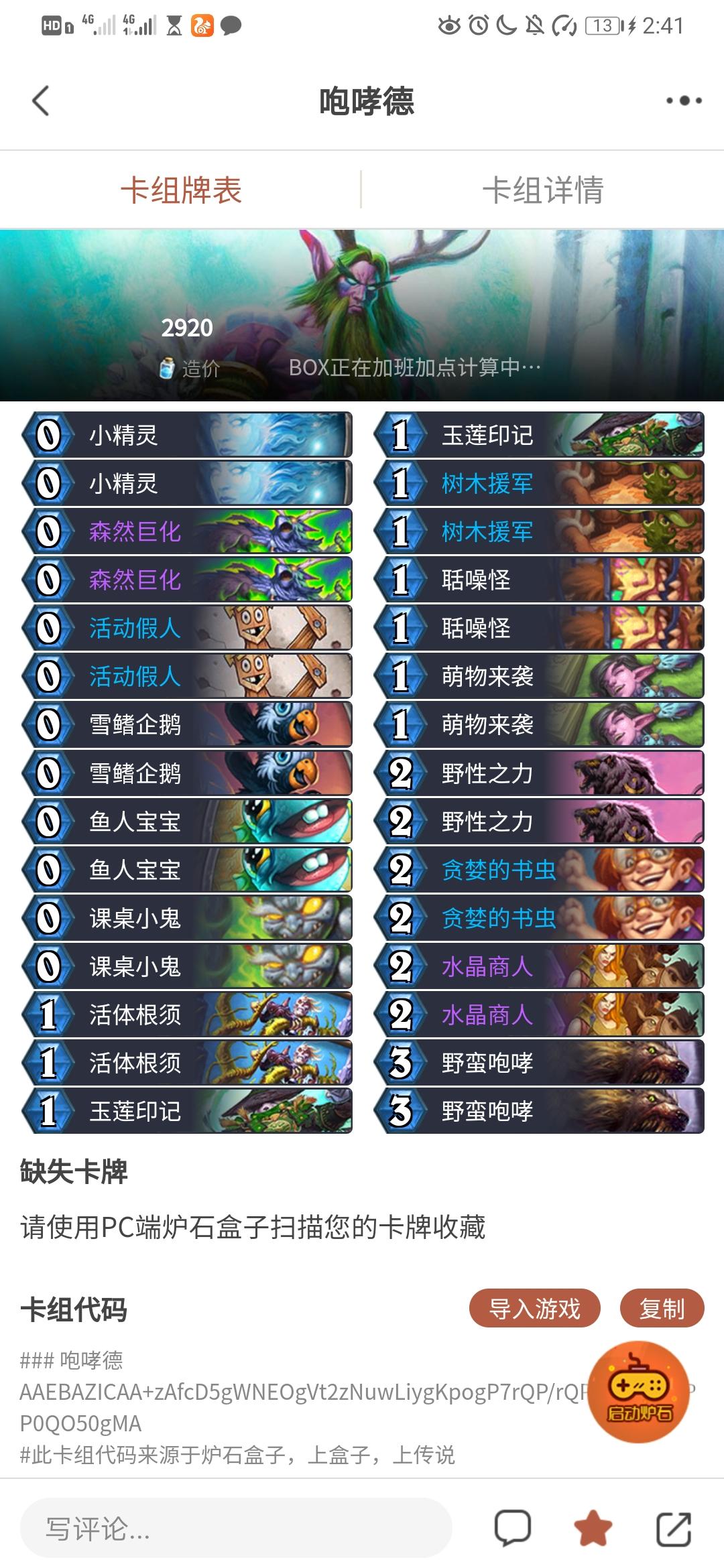 ### 咆哮德 # 职业:德鲁伊 # 模式:狂野模式 # # 2x (0) 小精灵 # 2x (0) 森然巨化 # 2x (0) 活动假人 # 2x (0) 课桌小鬼 # 2x (0) 雪鳍企鹅 # 2x (0) 鱼人宝宝 # 2x (1) 树木援军 # 2x (1) 活体根须 # 2x (1) 玉莲印记 # 2x (1) 聒噪怪 # 2x (1) 萌物来袭 # 2x (2) 水晶商人 # 2x