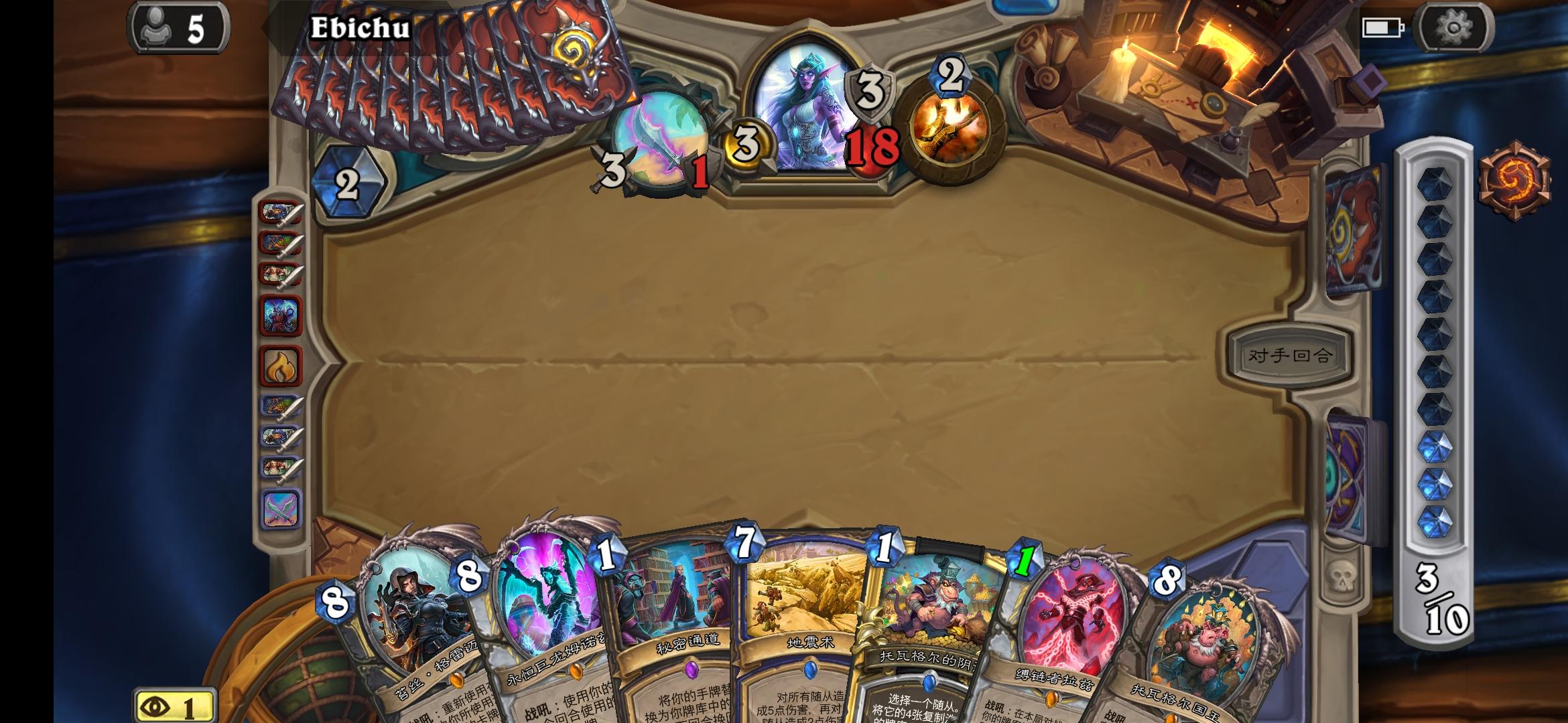 起手找二王子,慢速留恶毒召唤师,有两张留两张,法术全扔AAEBBB+KFp/DA6/XAwrh4wKc4gKDuQPB0AOFF8PqAp7iAvoOoIADhtMCCqLOA4SxA6CFA/yvA46tA9PNAtfrAseuAtDnAvu7AwA=分析对局:弃牌术,奇数萨,留深浅炸弹和狮鹫奥秘法,找前期怪站住场,法反对我们基本无效,手上法术多,硬币可以留,赌对面武器上手慢,用塞布卡她模