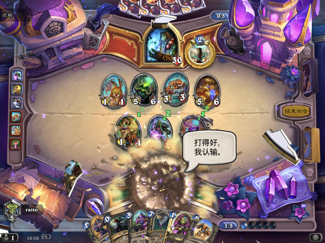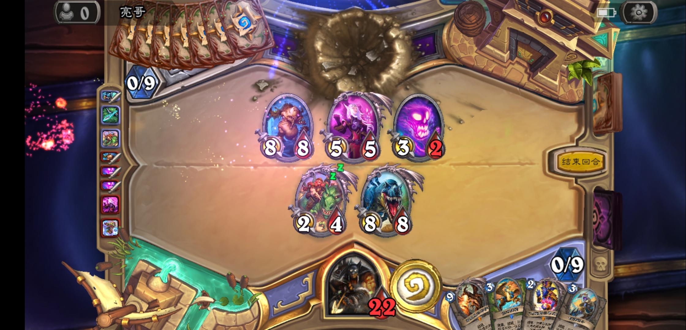 开局塞了2个炸弹进牌库,把他姐夫破了(他估计急没注意就把姐夫丢下来了),然后下回合2个炸弹连续爆炸(此时他牌库有23张牌);后边陆续塞了3个炸弹,塞玩到他就炸了,最后4血,被我武器打了一下塞炸弹,剩一血,到他时这个炸弹马上就抽到(此时他牌库还有19张牌),这就是玄学吗?5个炸弹都是塞进去,不出2个回合就炸了……可怕