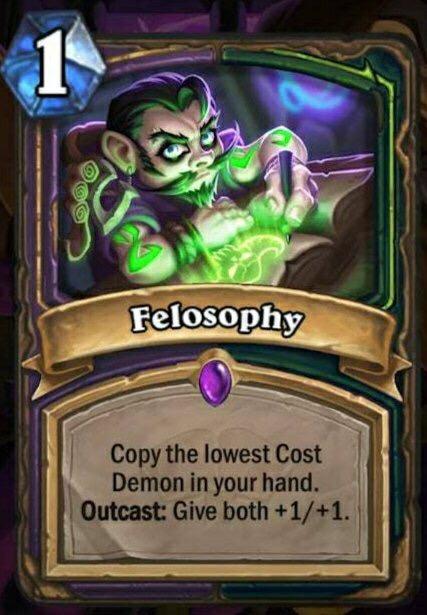 第一张为术士,恶魔猎手共用史诗法术,1费,复制你的手牌中法力值消耗最低的恶魔。流放:使它们都+1/+1。第二张为恶魔猎手稀有法术:将你的手牌洗入牌库然后抽4张牌。流放:你的对手也这样做