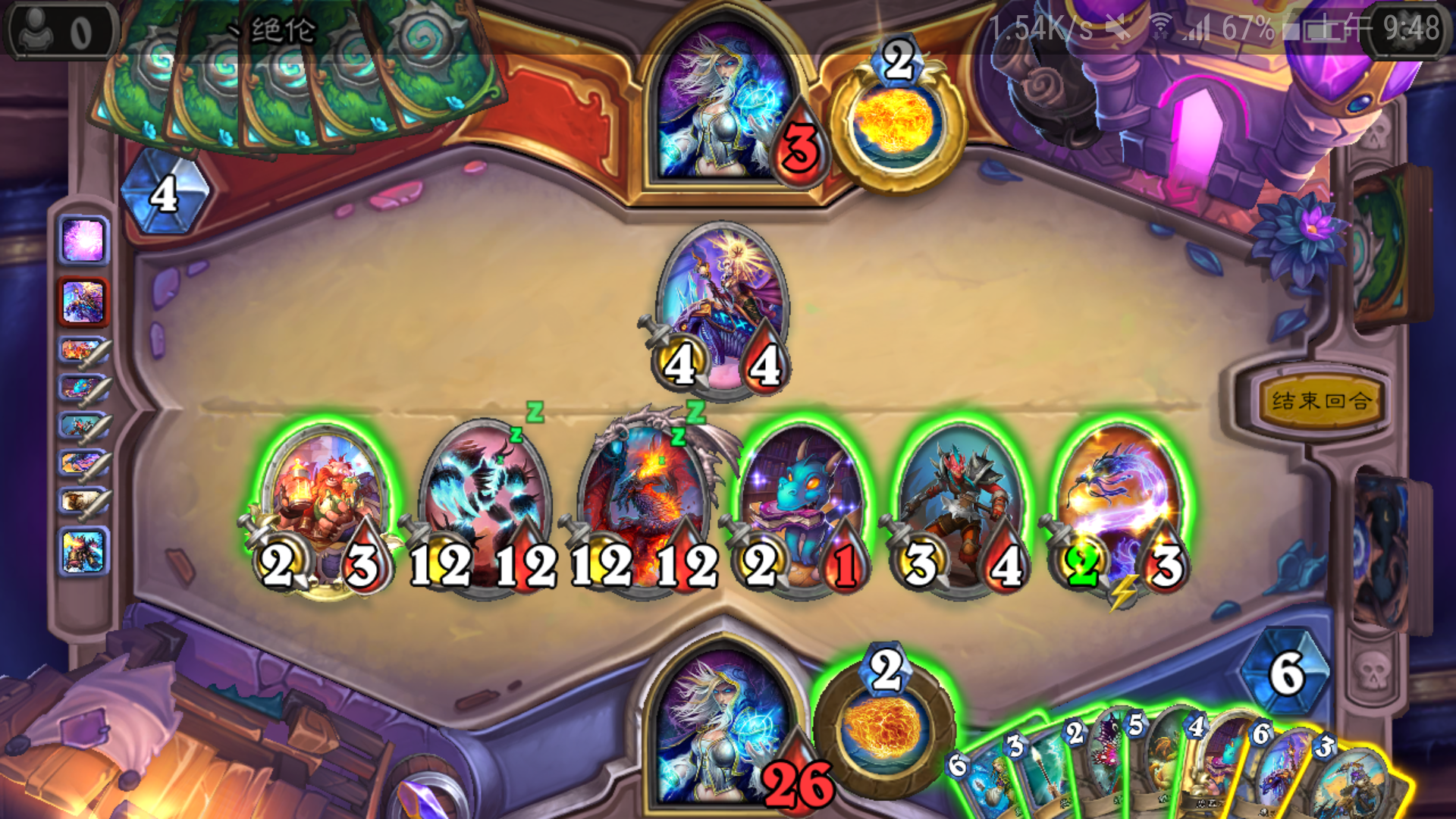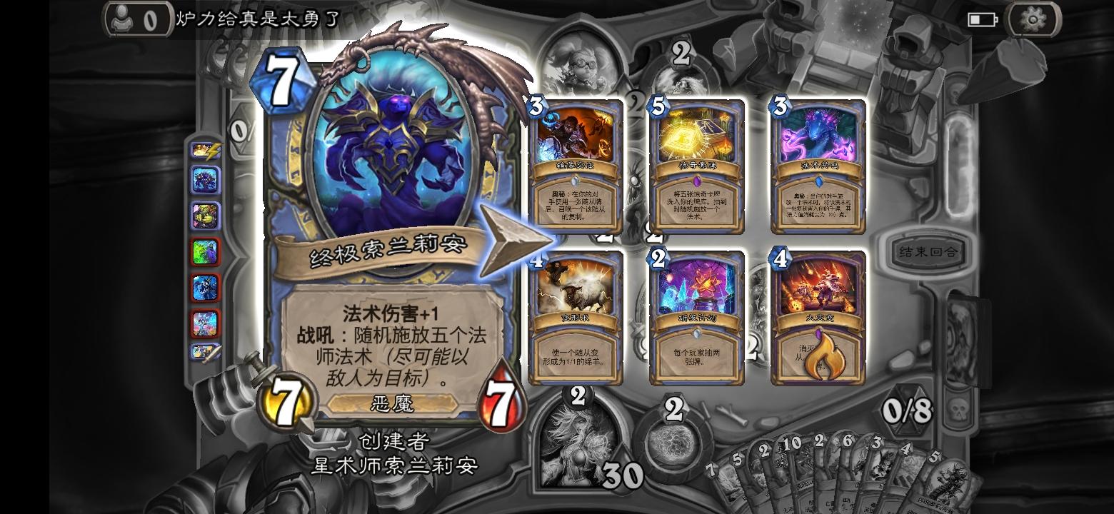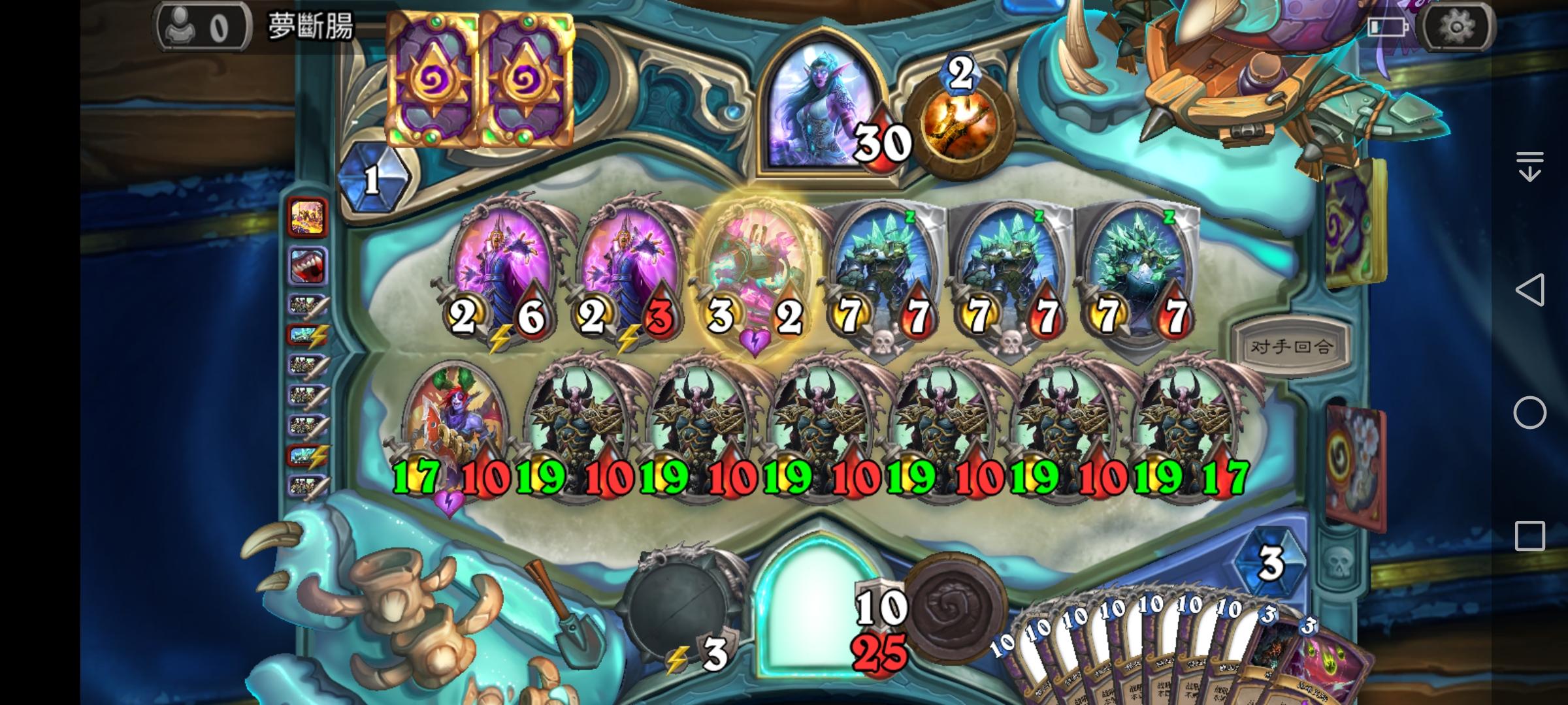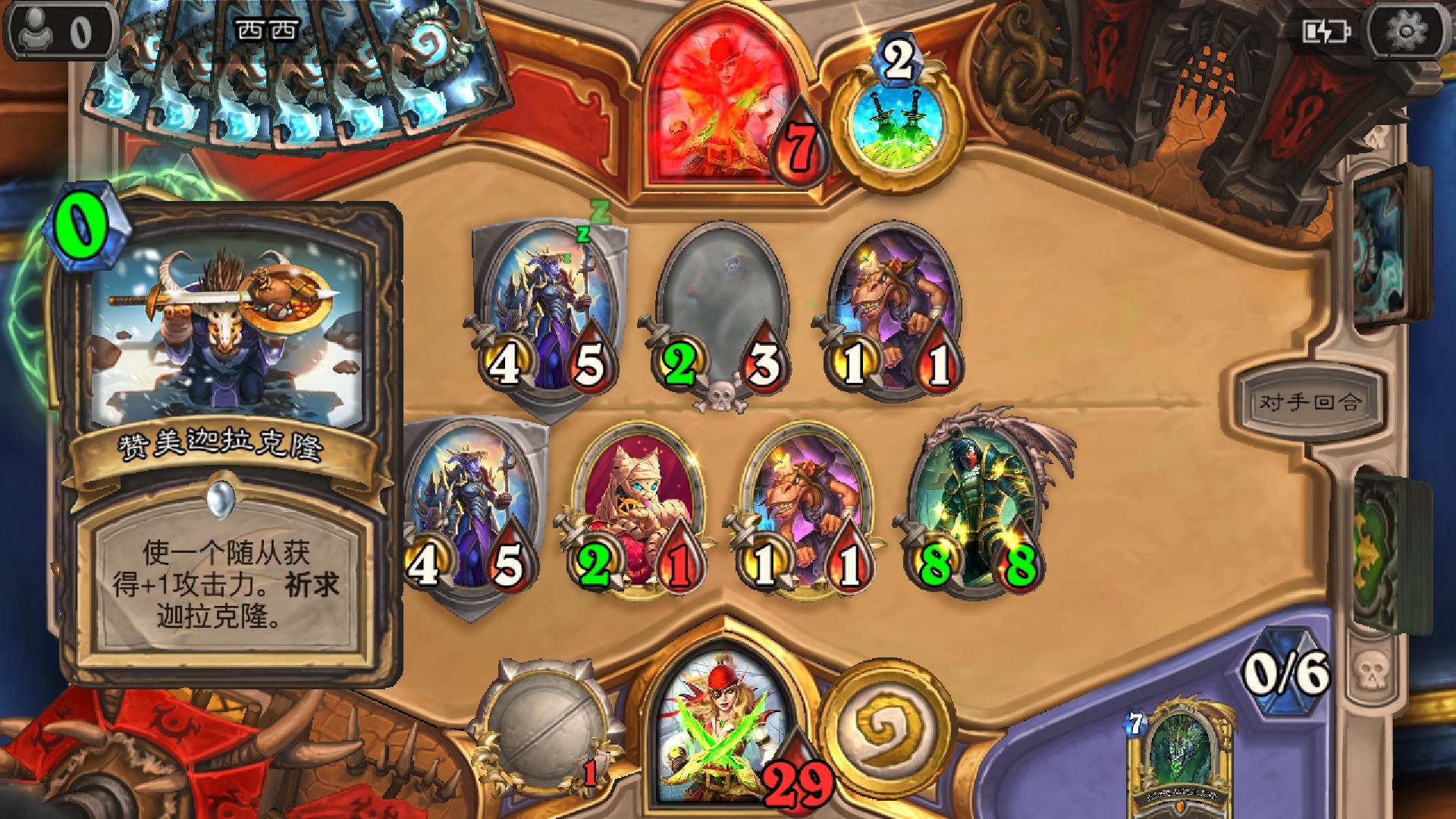 开局他招了那个会召唤一把1/3武器的1费兵,然后就召唤了那个传说的1/1海盗,接着我召唤两个小树苗,然后他在二回合又弄了两张1费的海盗。。。然后。。。然后我忘记了。。。挺危险的,如果他。。。哦,没有如果。。。