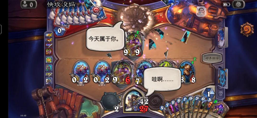 我用发现一张亡语牌找到术士终极。然后再洗终极。就这么的洗了大概三十多张。后面被换家德换掉了。最后神抽。抽上战士的终极。然后老婆过墙。直接爆踢他。最可怜的是古夫给我换过来了。太爽咯😂
