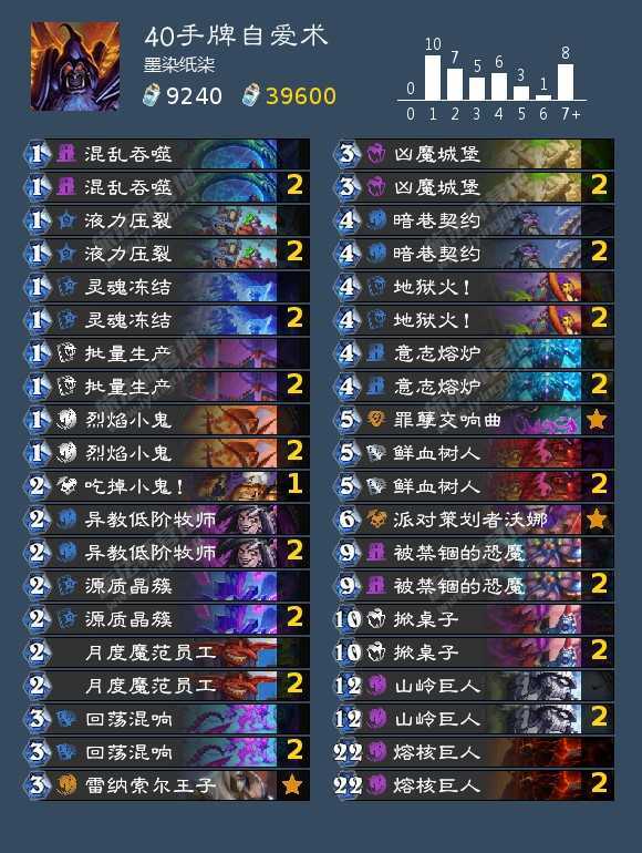 补丁之前一直在玩疲劳术,声浪被加一费之后直接废了。自己组了一套自残术推荐给大家,我敢说强度很高。起手留牌:批量生产、地标、暗像契约、巨人(有红石头的情况下留地狱火)注意烈焰小鬼和树人不是一费曲线 下不下取决于你要下哪个巨人。批量生产中后期慎用 会污染牌库一般情况下不主动解场,对面踢我们脸可以给红石头减费。回荡回响有两种配合,第一种配合是88大蛇复制,两张可以复制出4条大蛇,混乱吞噬可以