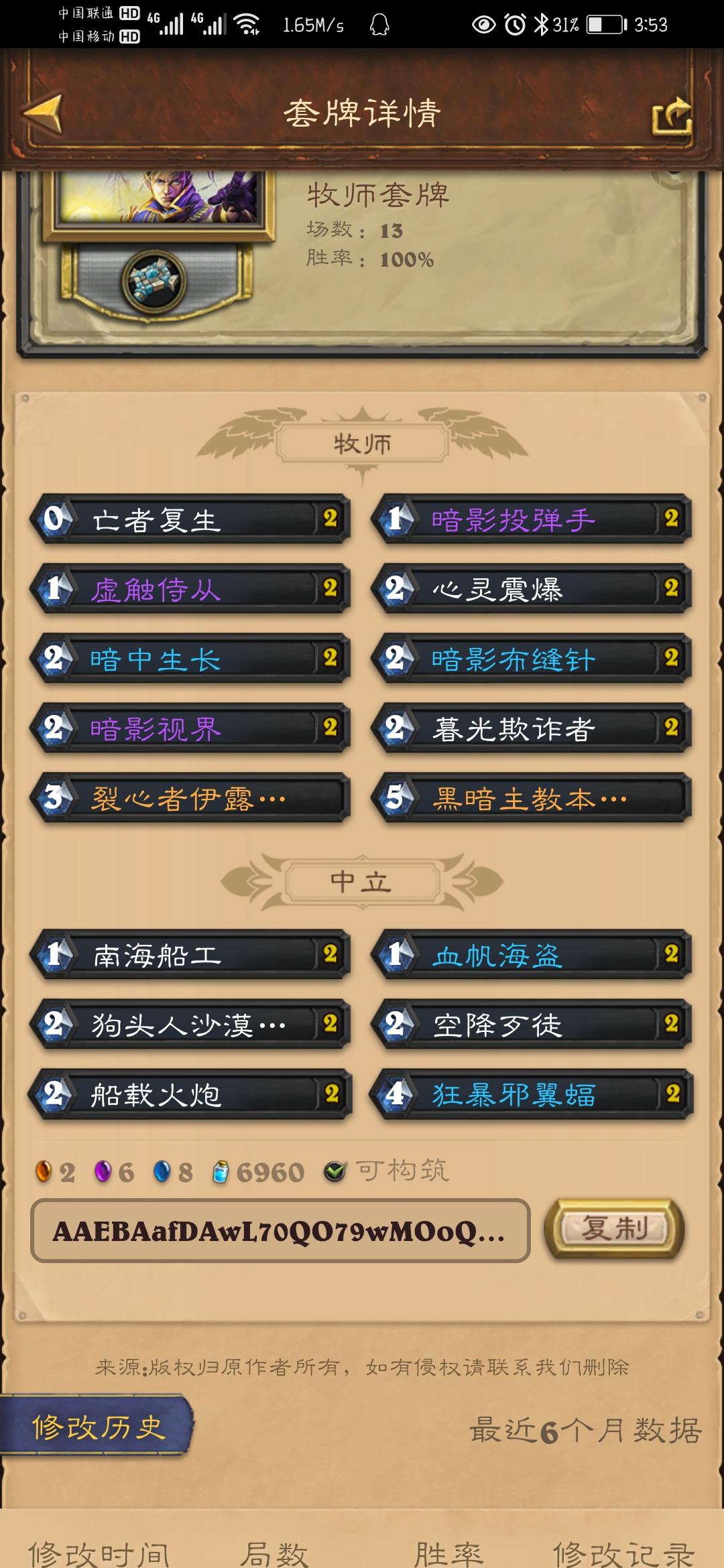 我组了一套砍马牧,然后我放弃了,打不过就加入。我真的吐了。两套牌我都放这了,你们研究吧,我乏了。