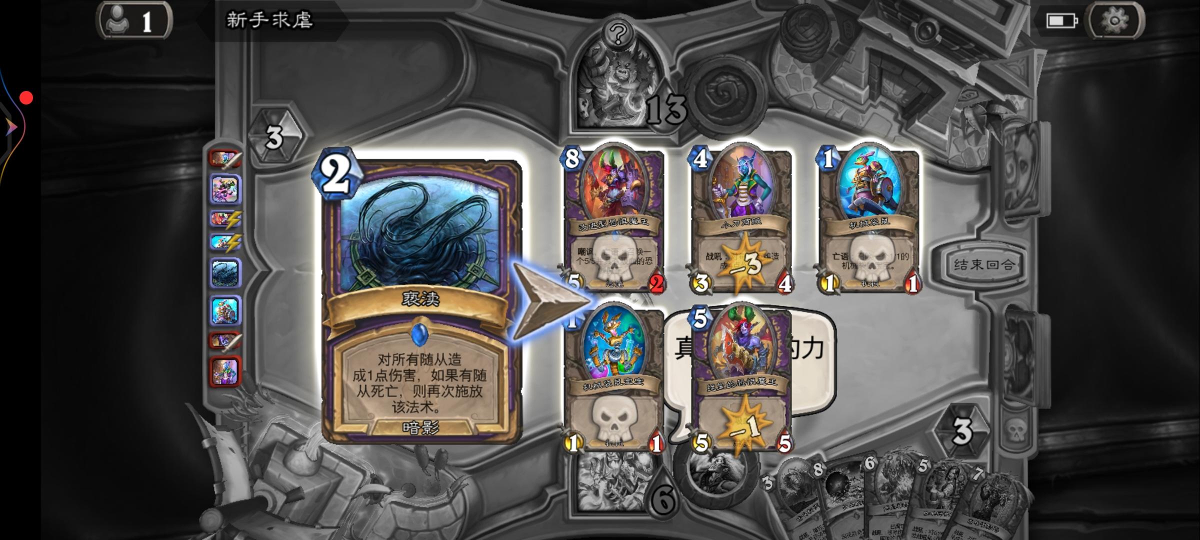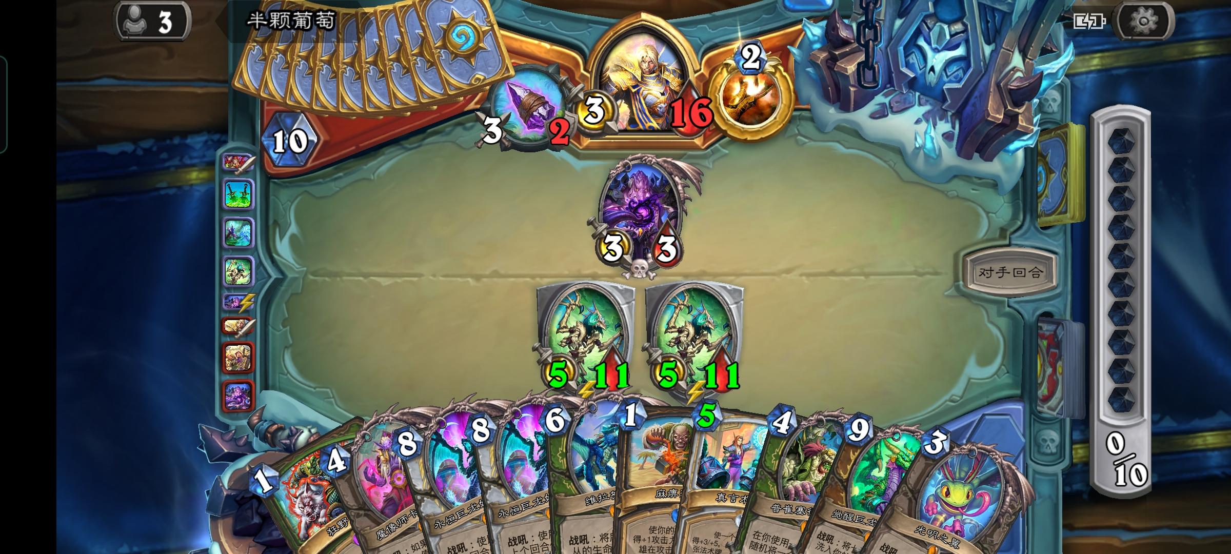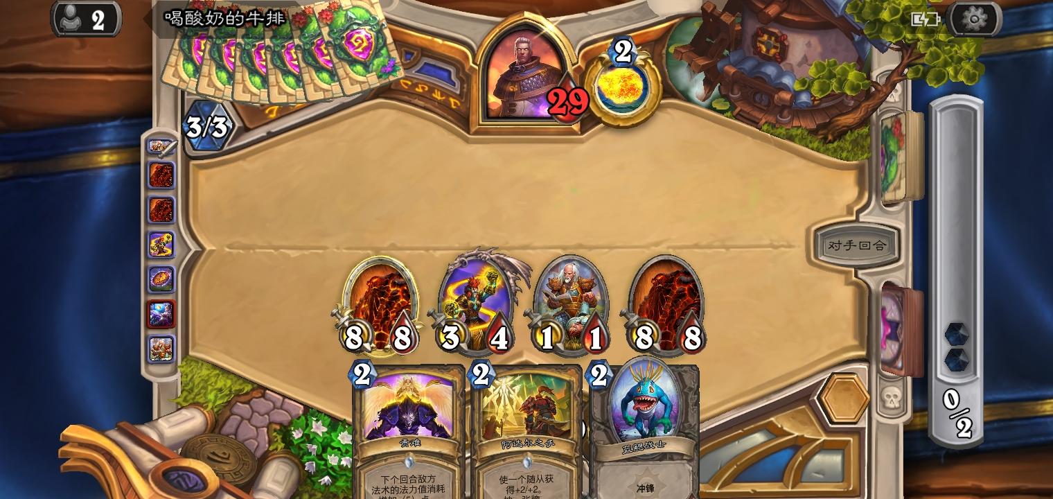 还只有1血。要活下来。857有一个吸血55,但是嘲讽还有2血,对面一个四血怪,利用袋鼠的12破2血的嘲讽放出55吸血,因为没有3所以对面34会活下来,然后狂乱对面31撞55吸血,成功回5逃了一回合。不愧是老术士玩家,好佩服我自己,活下去的欲望太强了。