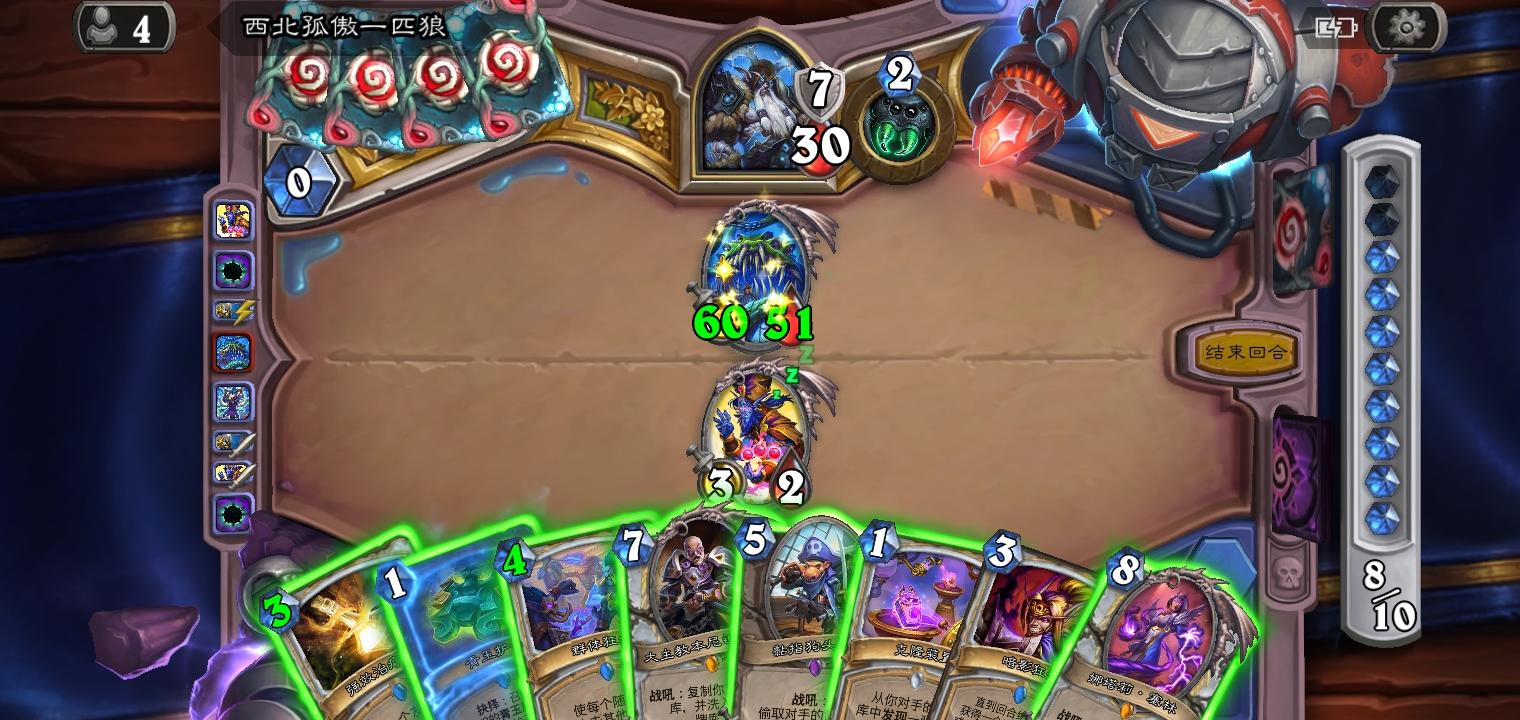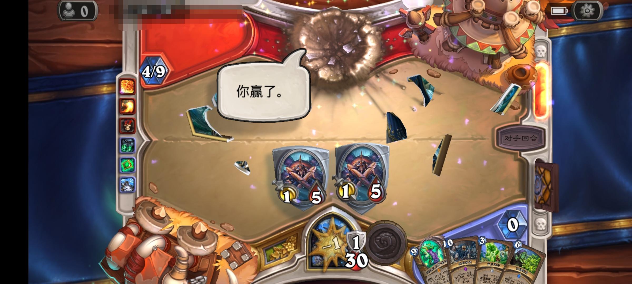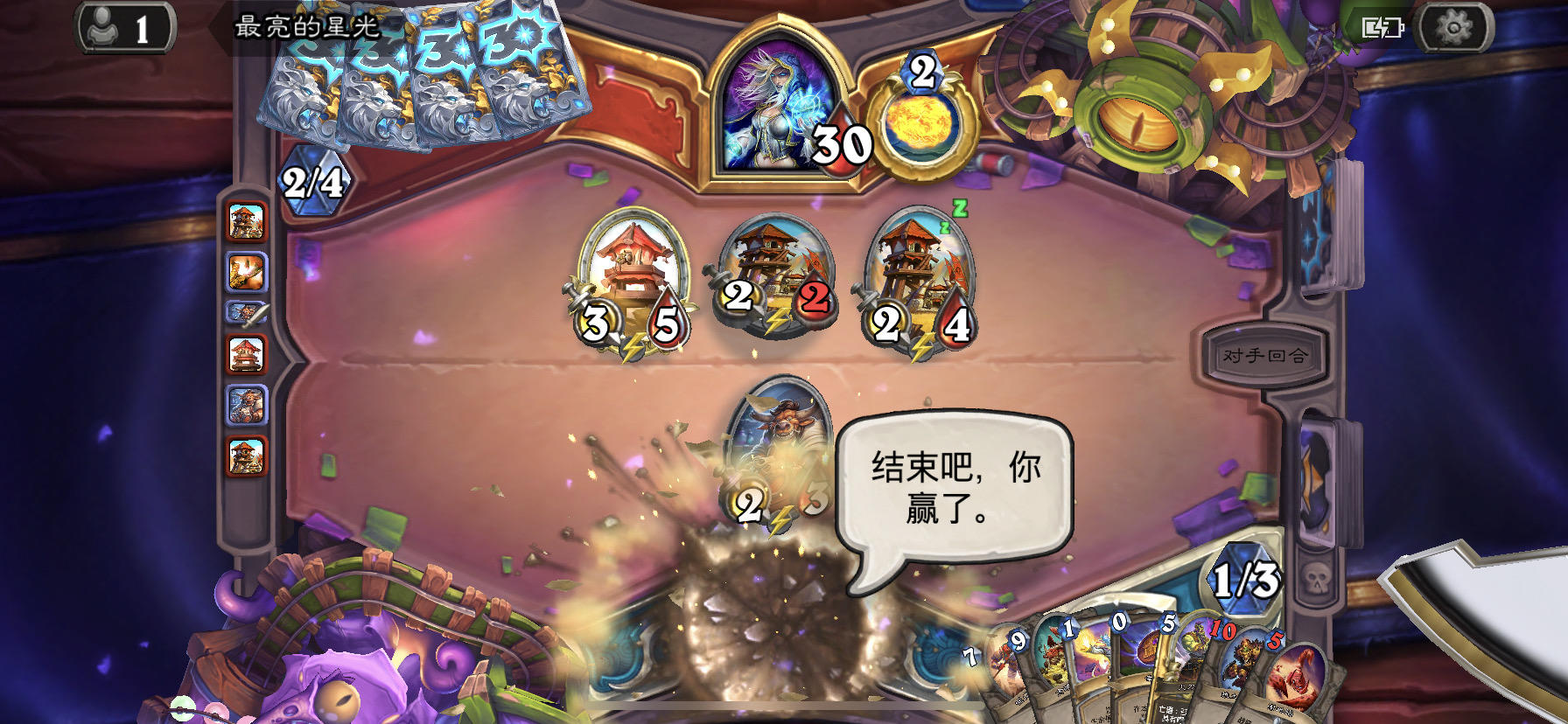 谁说牧师打不过术士(虽然接近10 0开),对面被我霍金拉了亚煞极,她还搞到了两个554可惜过牌断了,最后313绝望斩杀。