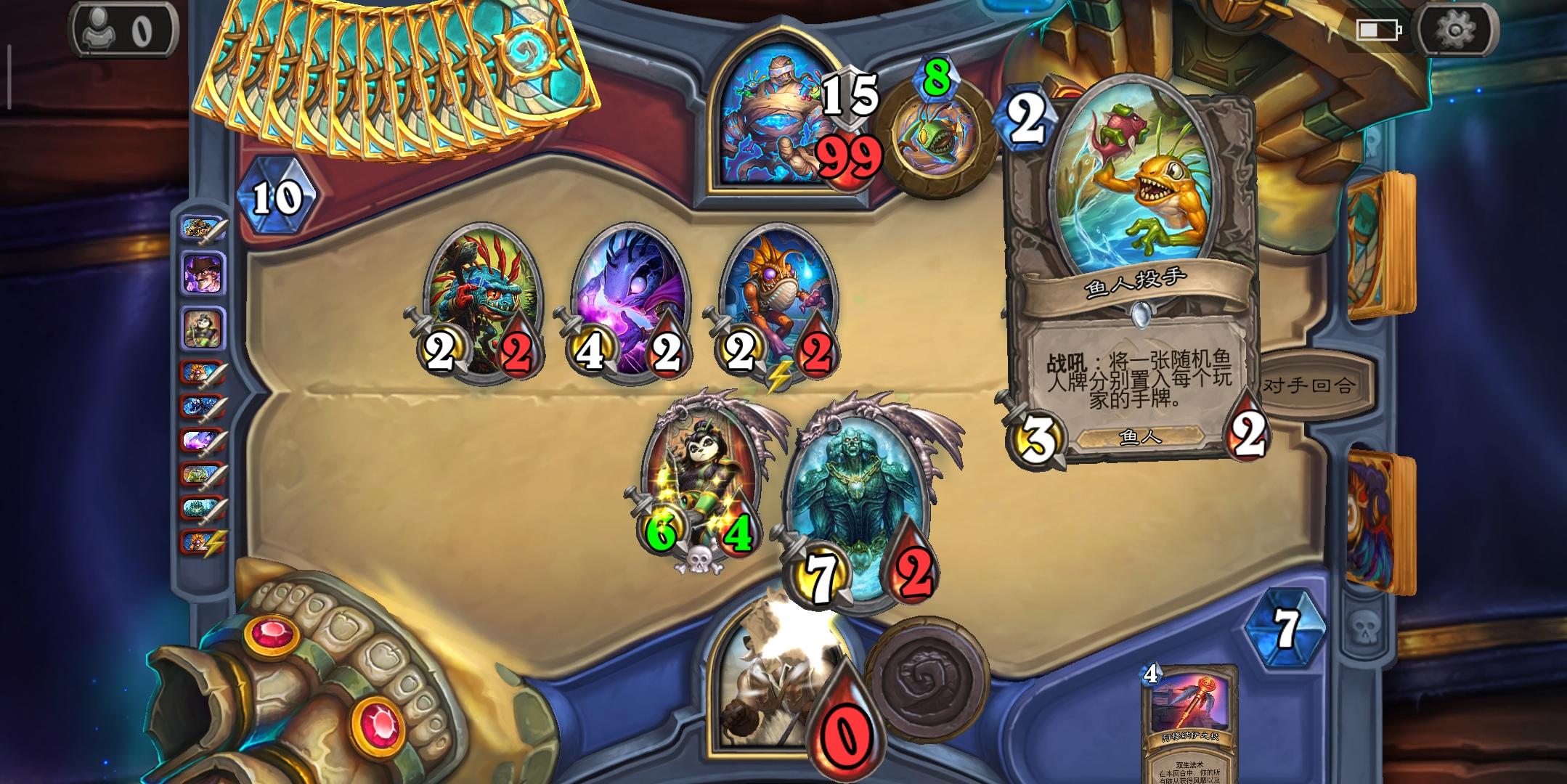 无限補充手下(而且变为消耗1),亚煞极拉已经多到滿卡组的手下,加上少量抽卡的卡,最后配上打破异变为双方召唤的宝箱所獲得的神奇魔杖(以及对方獲得使其降智的金狗头人像),轻松打死boss。提外话,对面二阶段时,召了克尔苏加德及八爪巨怪,我:这是叫我爆他牌吗?