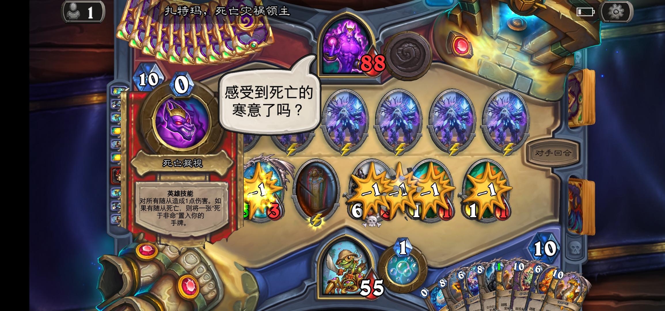 真的是欧爆了,第一关冒险虽然简单,但是能欧过也很开心。嗯,总之,先来个生命值双倍,这样你的血量比boss多,然后法术消耗生命值,加上神抽的大法师安东尼奥,我之所以在1费能打爆是因为在酒馆把安东尼奥降到了零费,只要神抽,第一回合都能赢,快乐了。话说我应该不是狗吧。(滑稽脸)