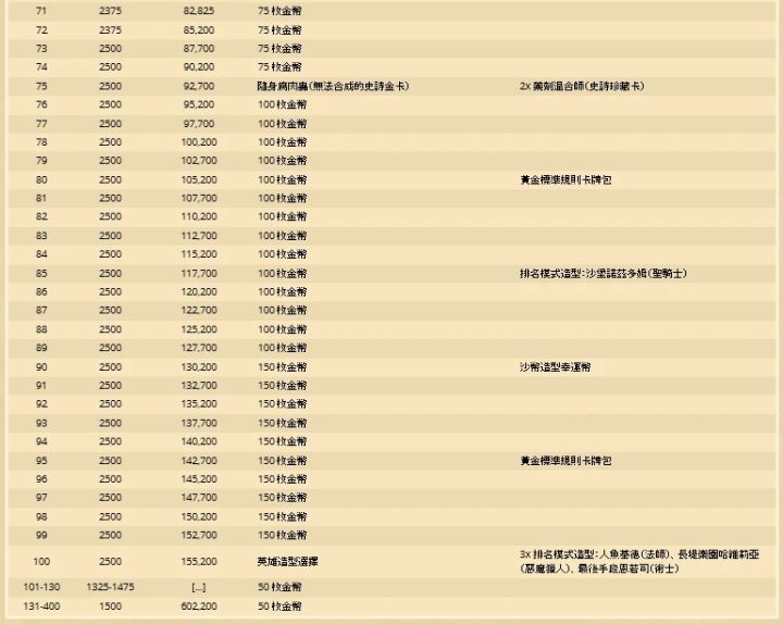 本文只针对打算入坑构筑模式(标准/狂野)的新人,战棋玩家可以忽略低肝度指的是至少能完成每日每周任务,每周完成一次乱斗首胜,这样平均每日游戏时间不会超过一小时。以下为粗略估算,能保证最少拿到这些奖励。不想看具体内容的可以直接拉到最后看结论主要的金币/卡包来源是免费通行证,通行证除了每个版本给的饰品奖励不同外,其他基本一样以最新版本的通行证为例,100级需要155200经验,每周任务三个,不更换