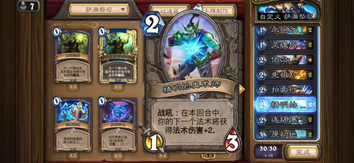 今天构思了一个狂野的萨满套路,开局挂新任务,然后找 锤喙 和 精明的奥术师用木锤给奥术师减费,启动前手里也要留两张低费能打脸的法术和一张雷霆绽放以及蓝宝石(宝石记得过载升级)做到任务完成后使用任务奖励卡的效果,然后找好机会锤喙——蓝宝石——雷霆绽放——(三级宝石为例,锤喙占满场)——用法术解掉一个锤喙——精明的奥术师——法术冲脸
